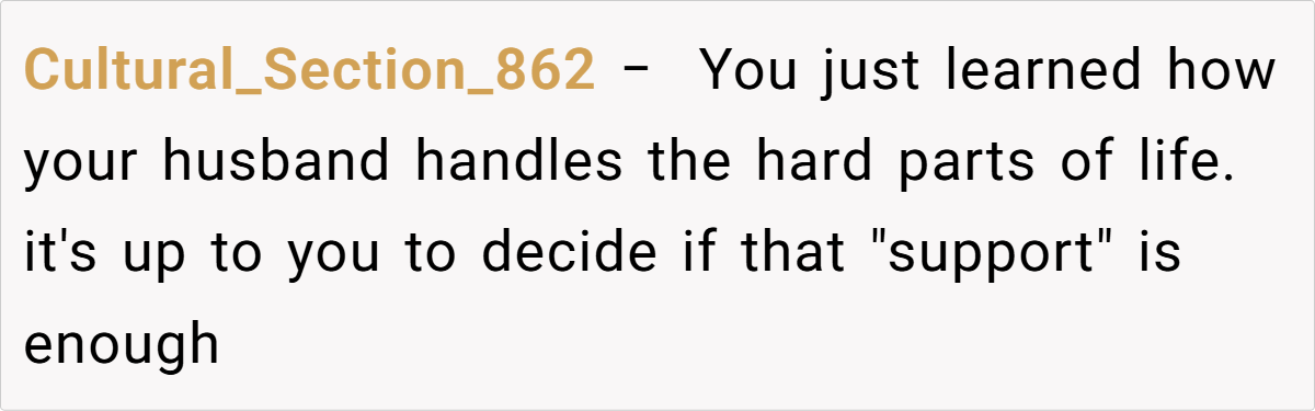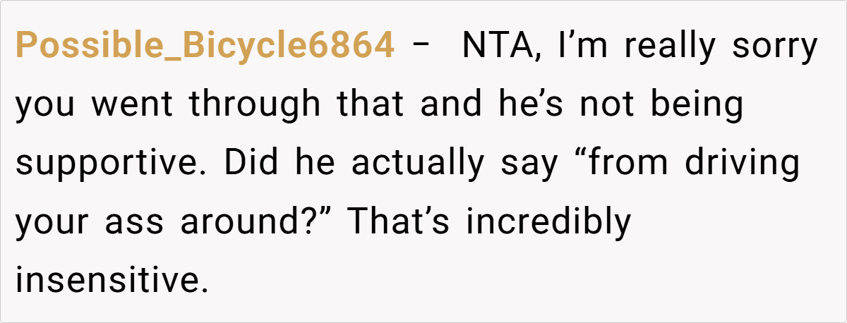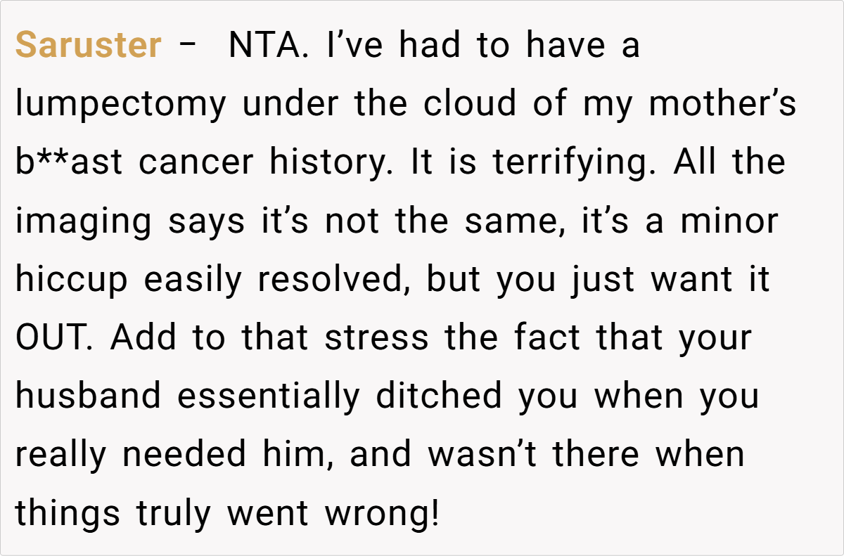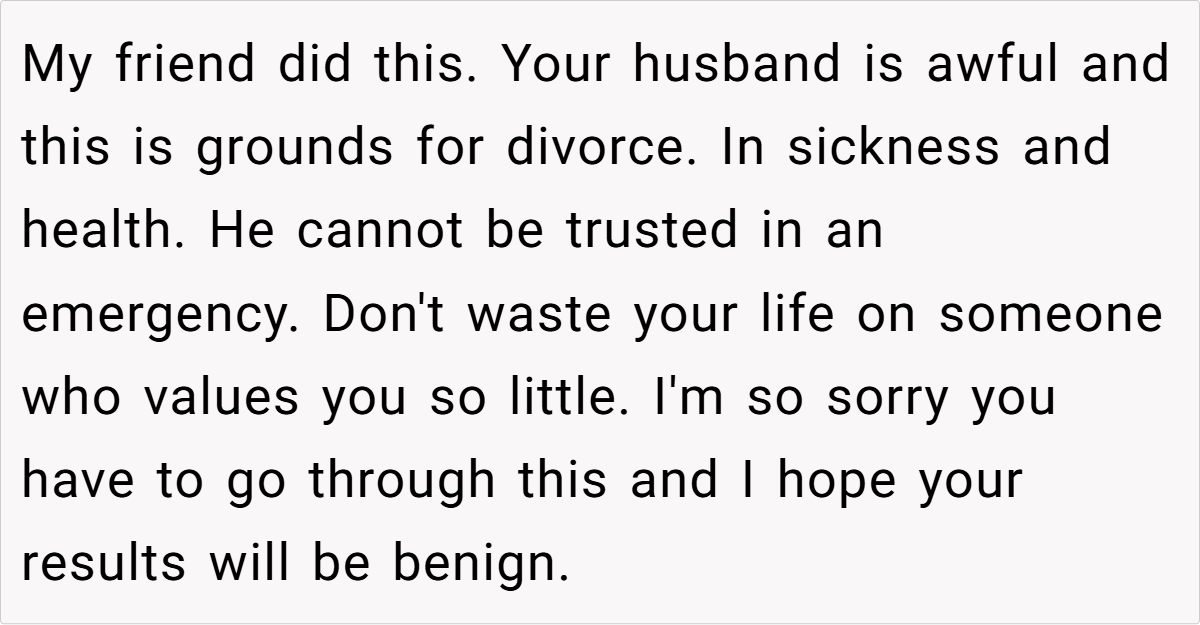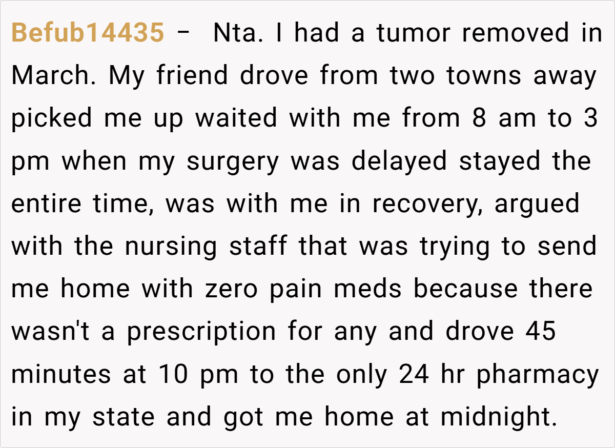 Many community members empathize with the patient’s experience. Some Redditors argue that while practical needs are important, they should never override the need for emotional support during a medical emergency. Others share similar experiences where a partner’s absence during critical moments left them feeling abandoned and unimportant.