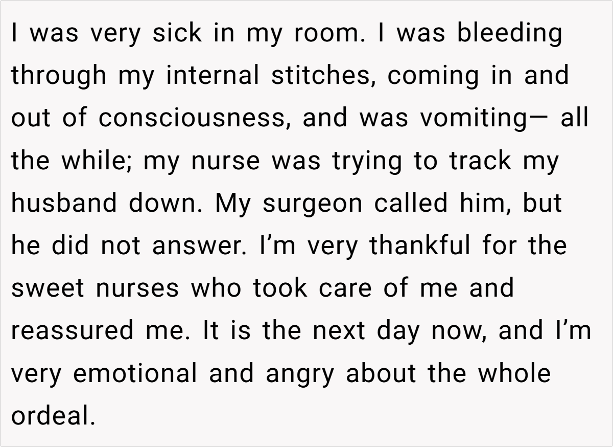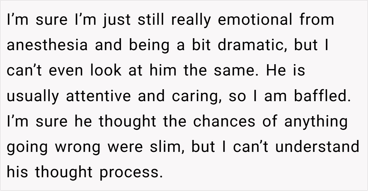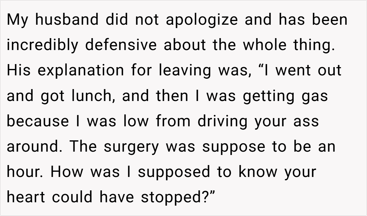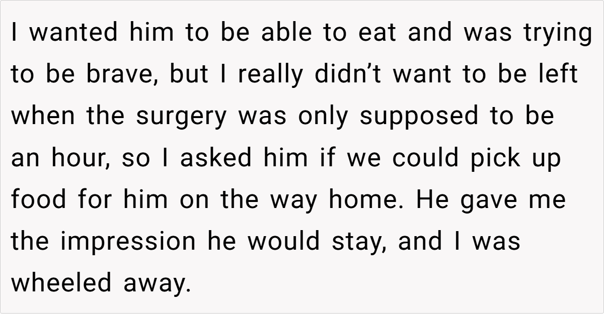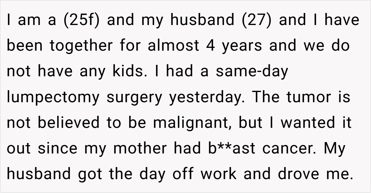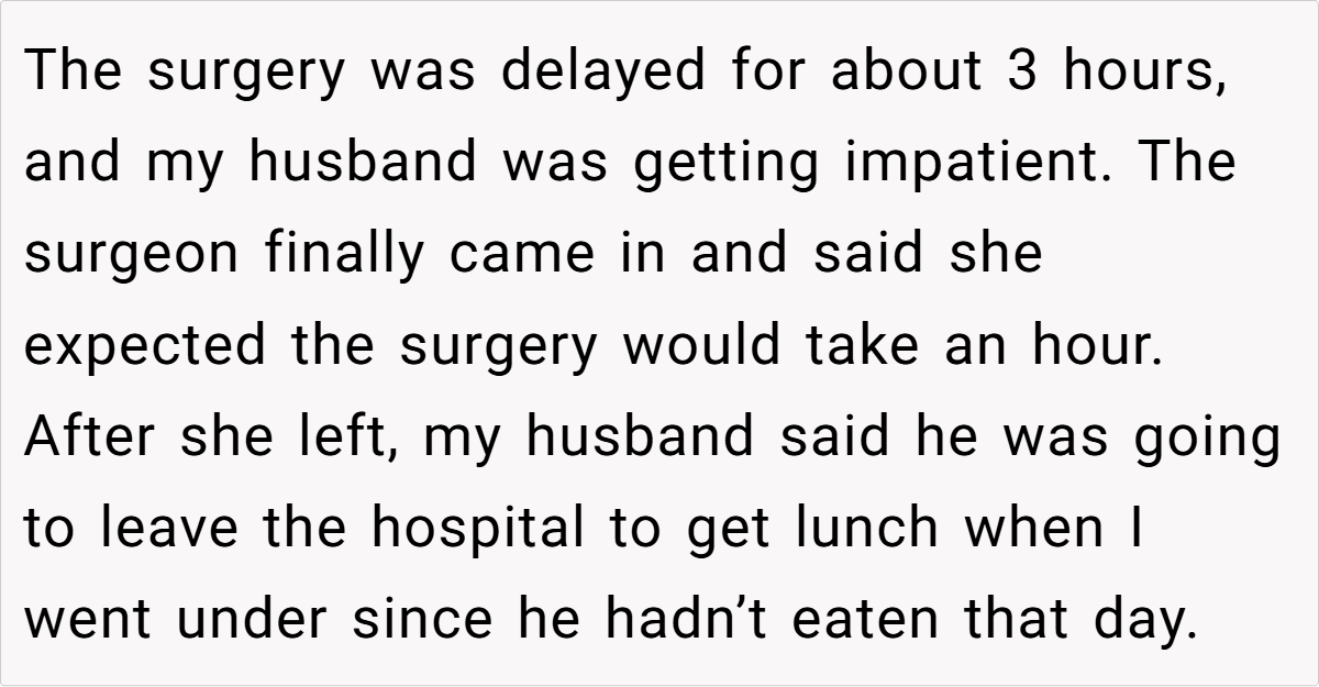 Undergoing surgery is one of the most vulnerable times in anyone’s life—and having your partner there can mean the difference between feeling safe or utterly abandoned. In this case, a 25‑year‑old woman, who recently underwent a same-day lumpectomy, recounts how her husband left her during the procedure to get lunch and gas. Although the surgery was initially scheduled for an hour, unexpected complications arose, leaving her in critical condition. Instead of remaining by her side, he chose to step out, prompting a fierce argument when she recovered.