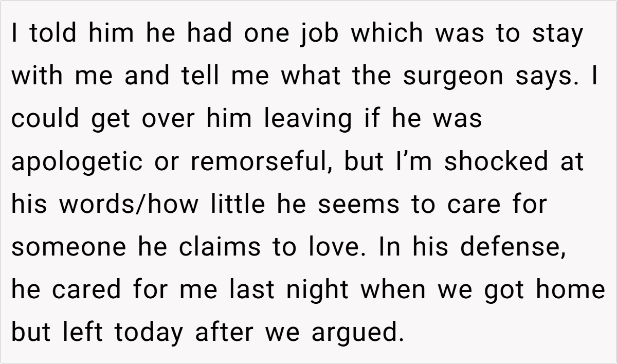 ‘AITA for getting into an argument with my husband because he left me during surgery.’