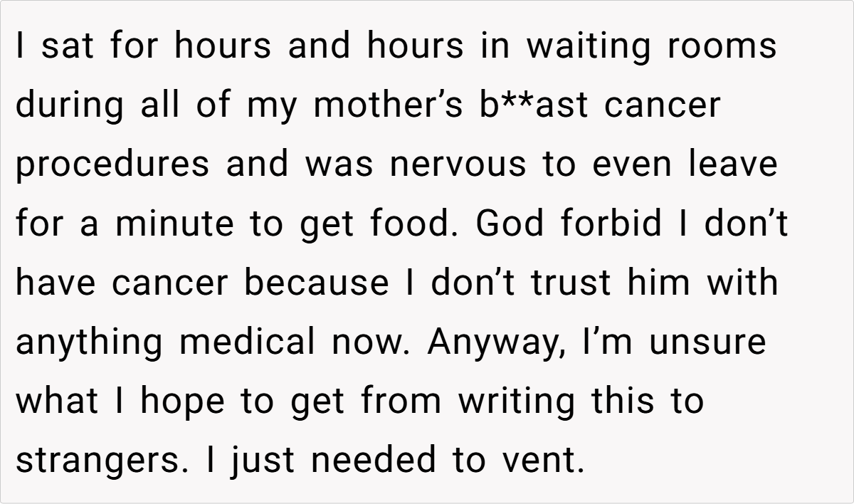 Her feelings of betrayal and distress are compounded by the fact that she had a history of anxiously waiting for her mother during her own family’s medical ordeals. The emotional scars from that past experience made his absence all the more painful. Now, as she navigates the recovery process, she struggles to reconcile his explanation with the care and support she desperately needed at that moment.