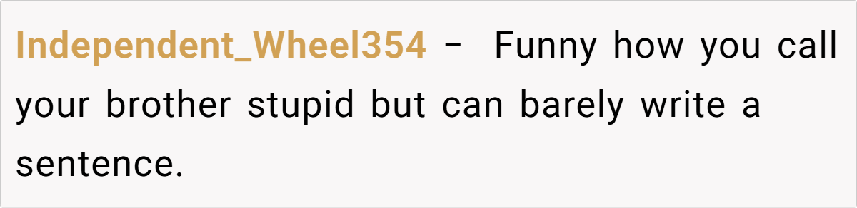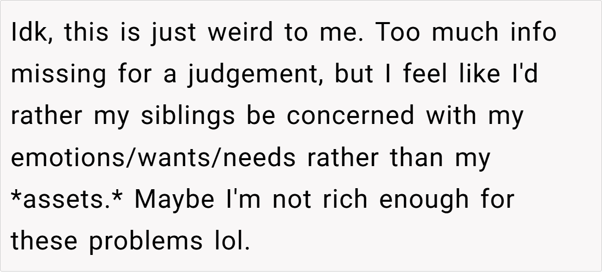 Many redditors express disbelief at the sister’s bold decision, with reactions ranging from playful jabs at her “tough love” approach to genuine concern for the fallout on family ties. These lively discussions underscore the diversity of opinions in the community, leaving us to ponder whether protecting family assets is worth the personal cost.