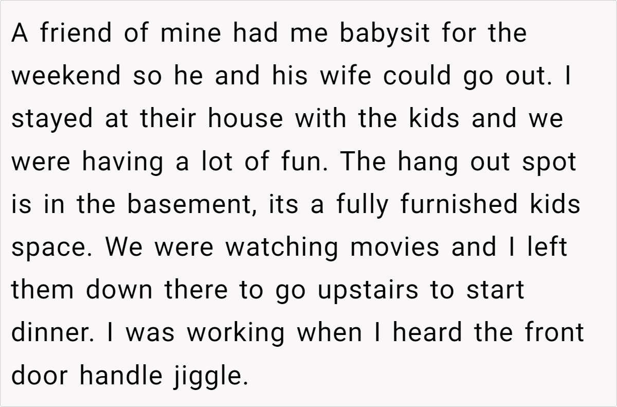 Late one weekend, an ordinary babysitting gig took a dramatic turn that would soon spark heated debates online. While looking after the kids in a cozy, well-equipped home, our babysitter found themselves at the center of an unexpected crisis when a determined knock at the door disrupted an otherwise calm evening. The air grew tense as an unfamiliar, urgent voice demanded entry, setting off alarm bells about safety and responsibility.