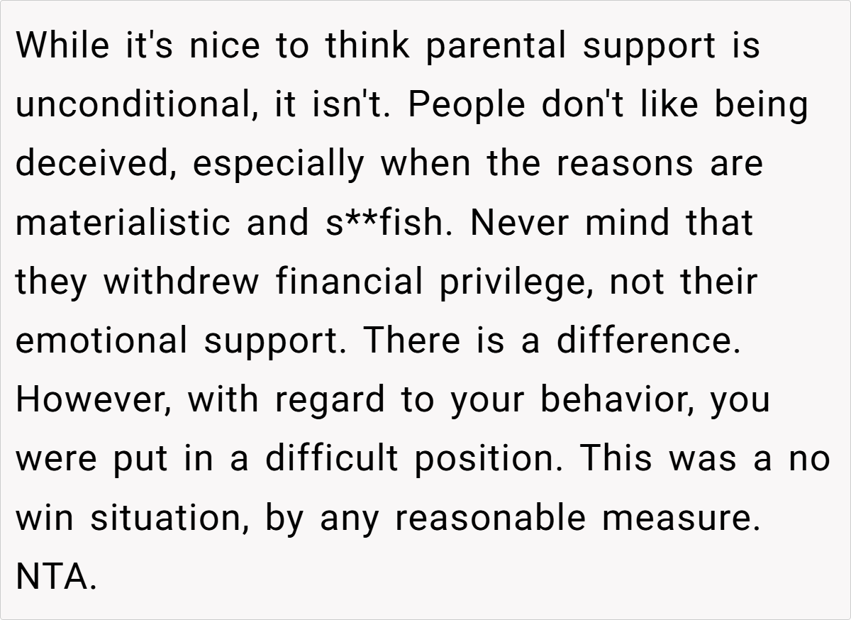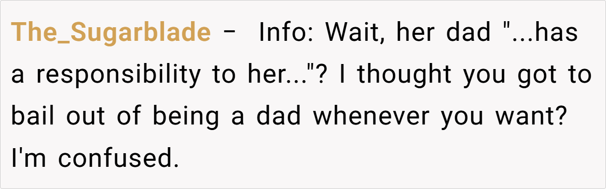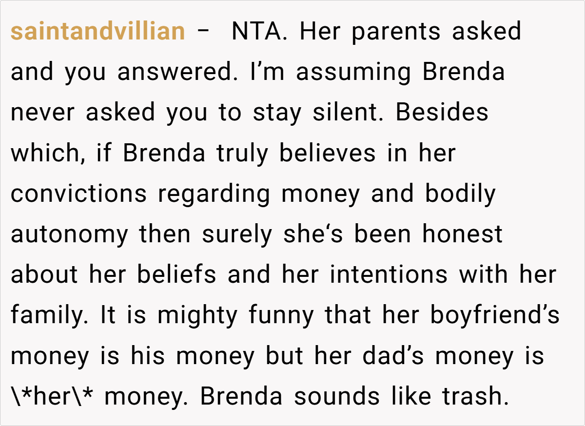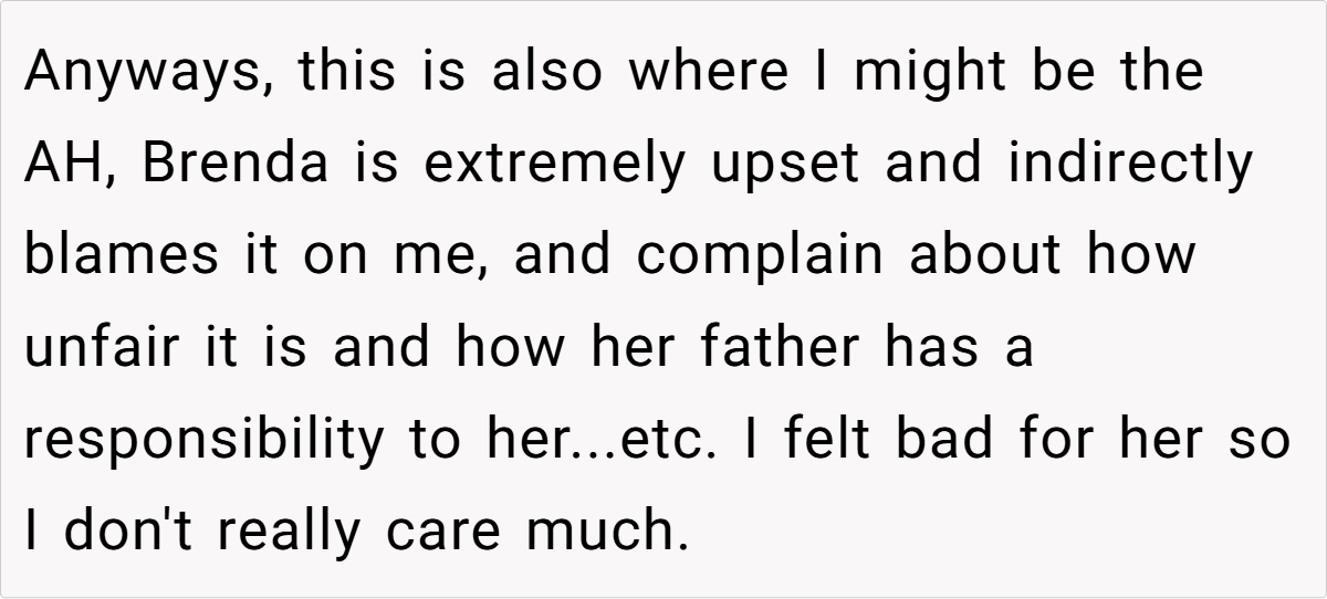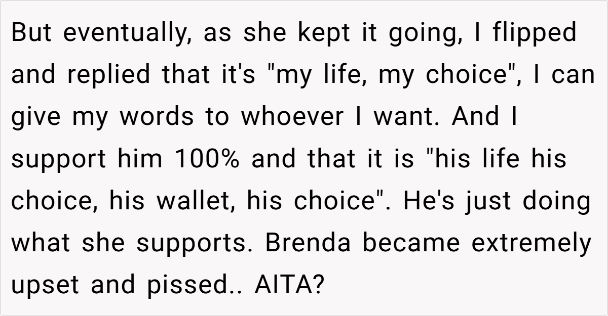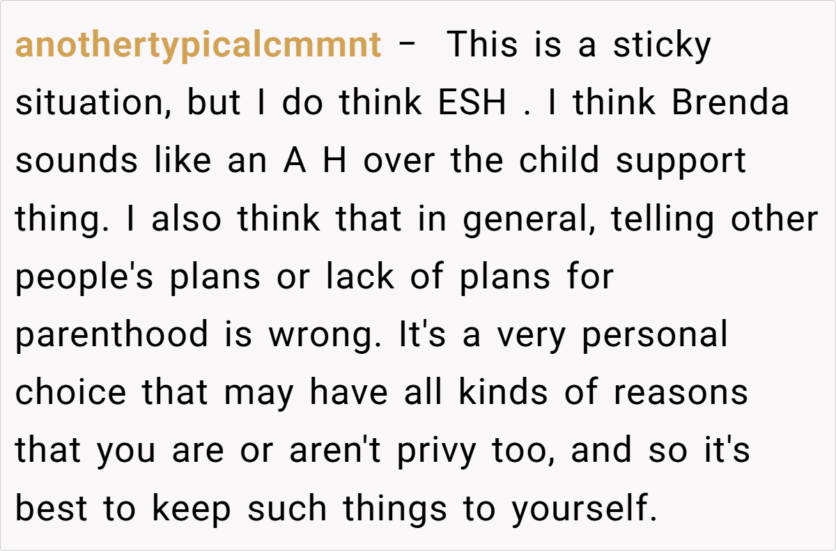 The Reddit community has been fiercely divided on this issue. Many redditors have defended my stance, arguing that supporting a parent’s decision to shirk responsibility is unacceptable. Comments ranged from “standing up for the child’s well-being” to criticisms of Brenda’s choice, with some even calling her actions “irresponsible” and “detrimental to her future.”