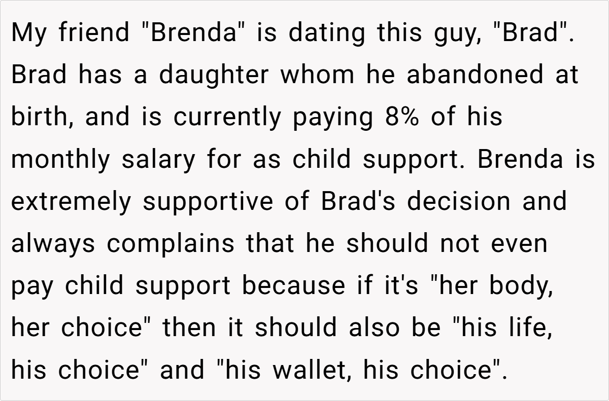 Friendships can sometimes reveal our deepest values—especially when they clash with our moral beliefs. In this case, a close friend, Brenda, has found herself in a controversial relationship with Brad, a man who abandoned his daughter and pays only a fraction of what’s expected in child support. While Brenda champions his decision—asserting that “his life, his choice, his wallet, his choice”—I hold a fundamentally different view.