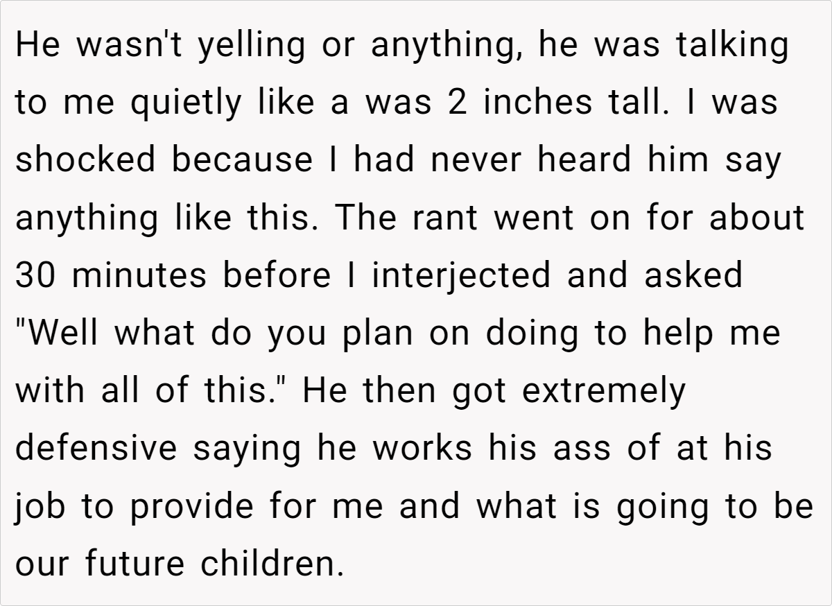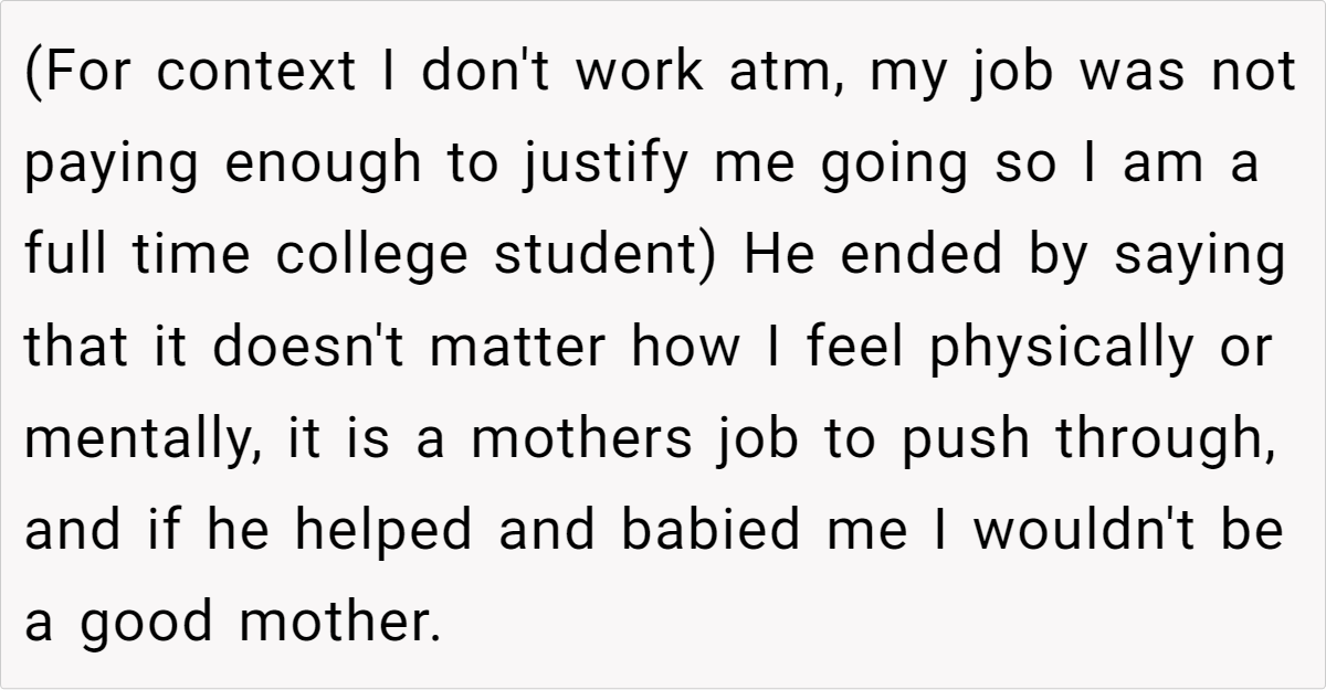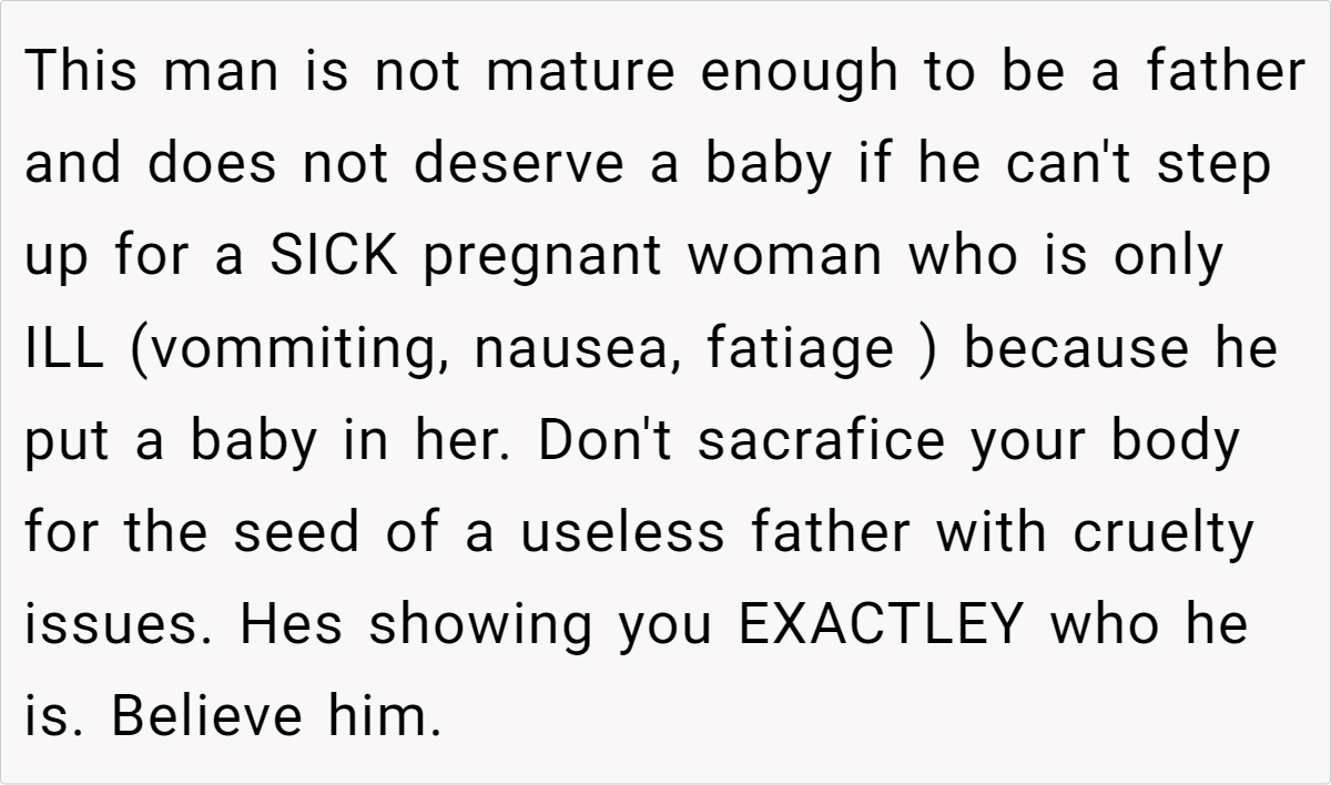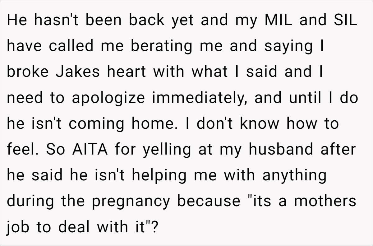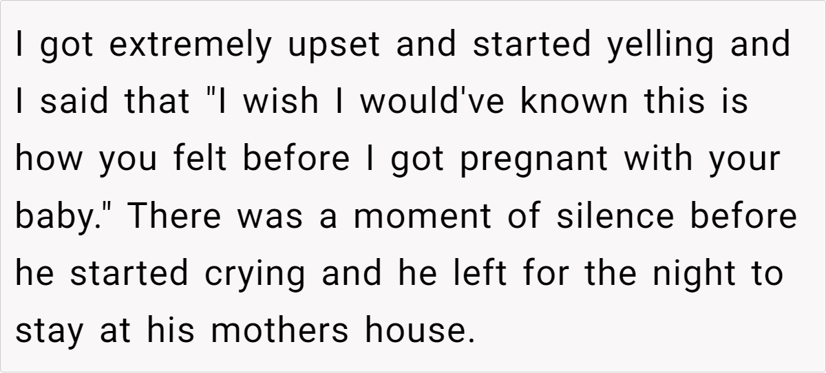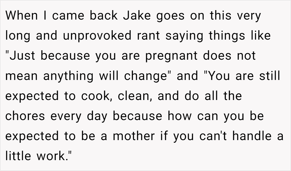 Now, she’s left questioning not only how this marriage will function as her pregnancy progresses, but also whether her husband truly believes that “motherhood means dealing with everything alone.” Should she stand her ground and demand equal support? Or is this a warning sign that runs far deeper than a simple division-of-labor dispute?