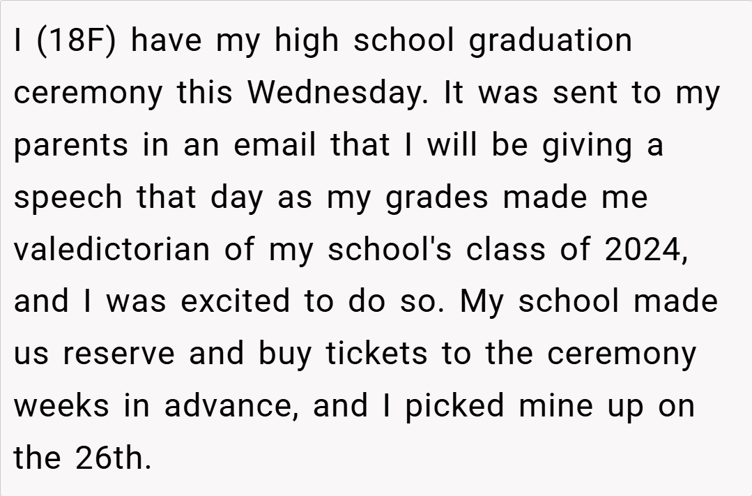 The introduction outlines how an 18-year-old valedictorian, excited about her graduation, felt deeply hurt when her dad and sister chose to prioritize a sleepover over attending her ceremony. Upset by their lack of support on such a milestone day, she ended up giving away their tickets, leaving only her mom to attend. This act was born out of frustration and disappointment, as she believed her achievements deserved proper celebration and respect.