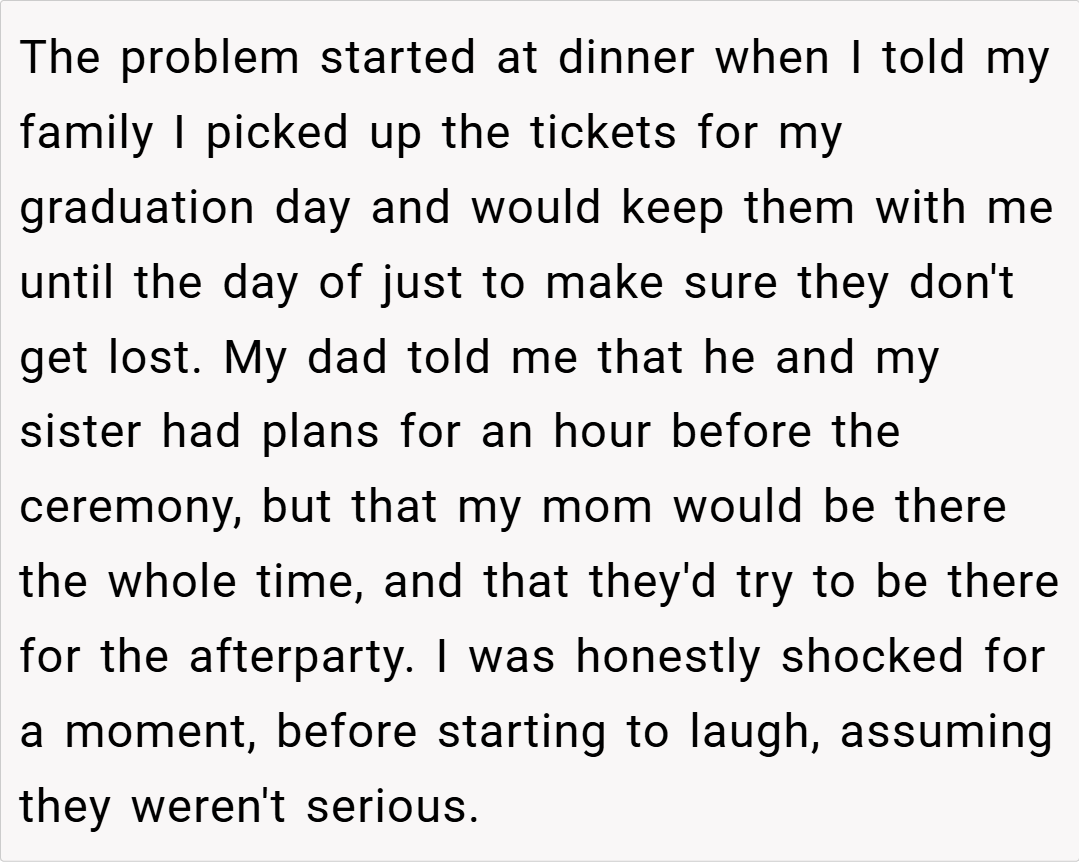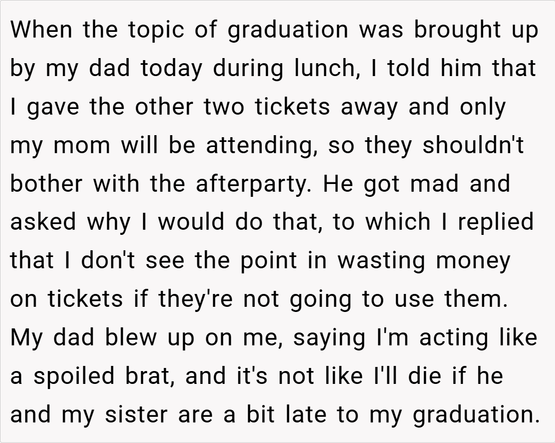 ‘AITA for giving away my dad and my sister’s tickets to my graduation ceremony and telling them to not bother showing up?’