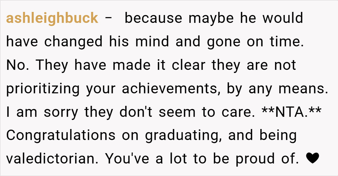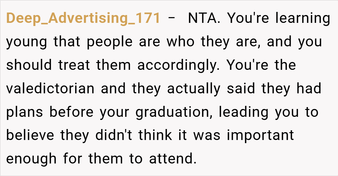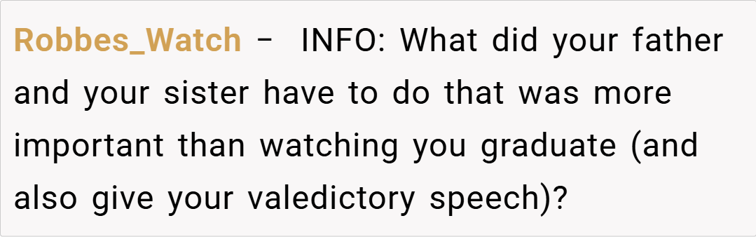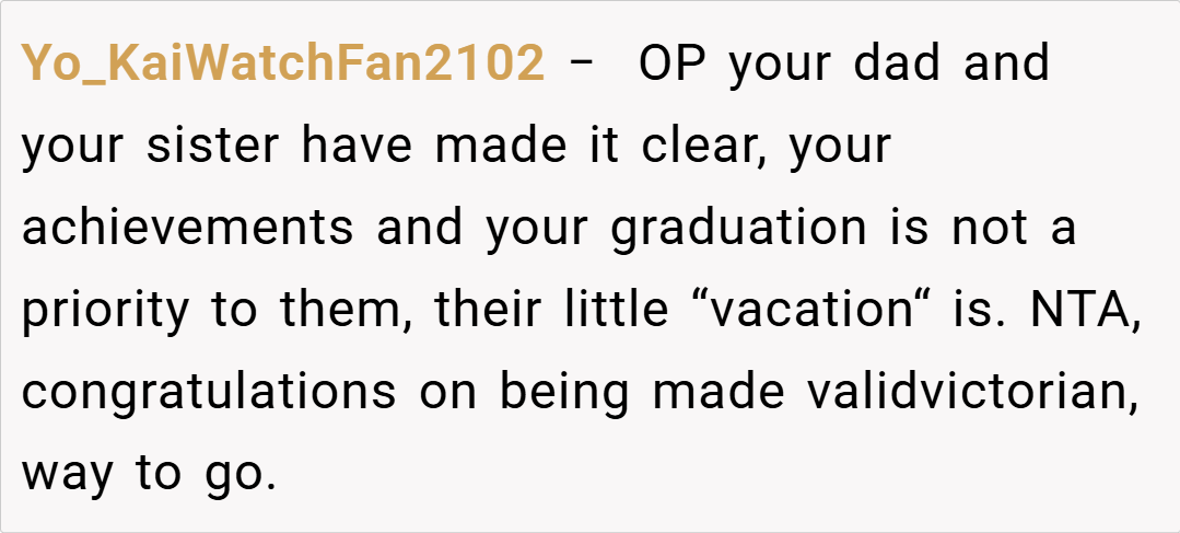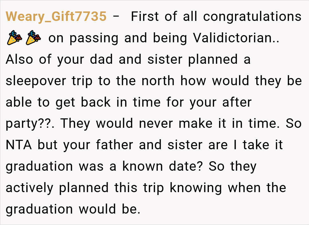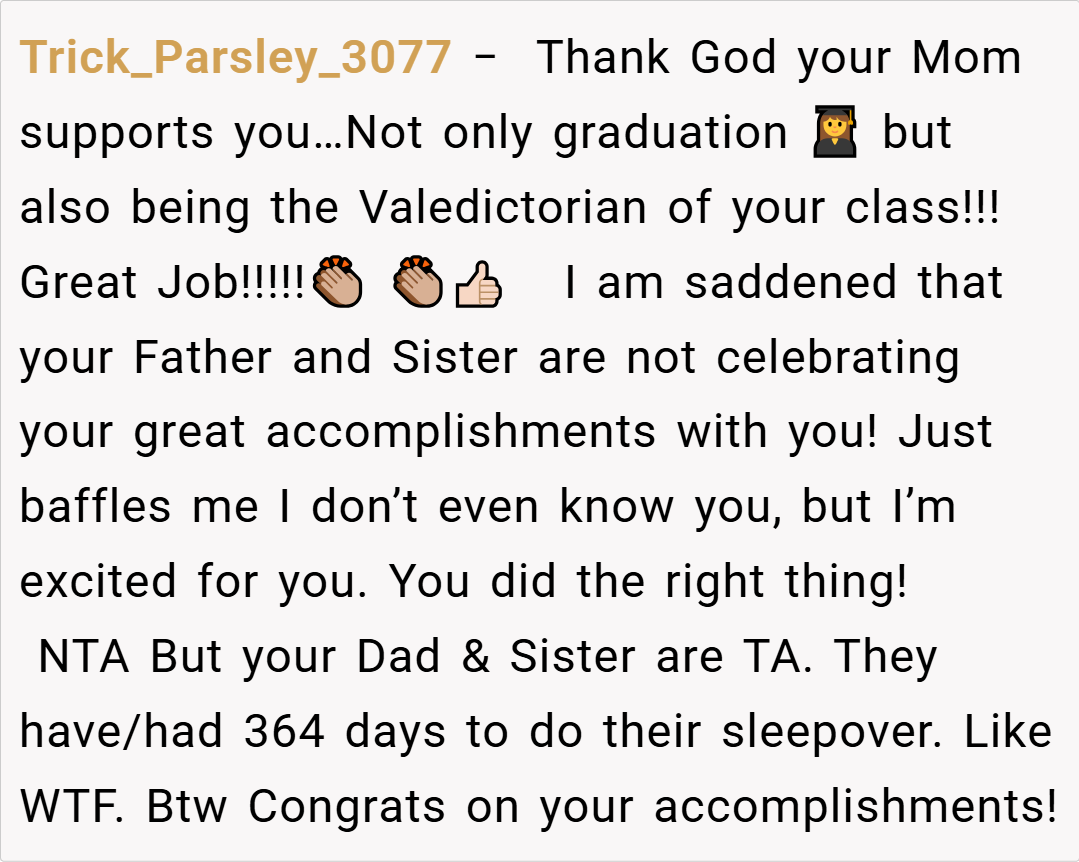 The comments are unanimous in their support for the daughter’s actions. Many express shock that her dad and sister would choose a sleepover over a graduation ceremony, with some even calling their plans disrespectful. The prevailing sentiment is clear: when it comes to celebrating major accomplishments, presence matters. Friends and fellow Redditors applaud her for standing up for herself, noting that such milestones are not to be compromised by half-hearted family attendance.