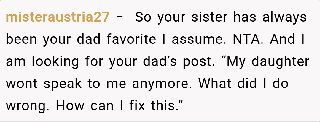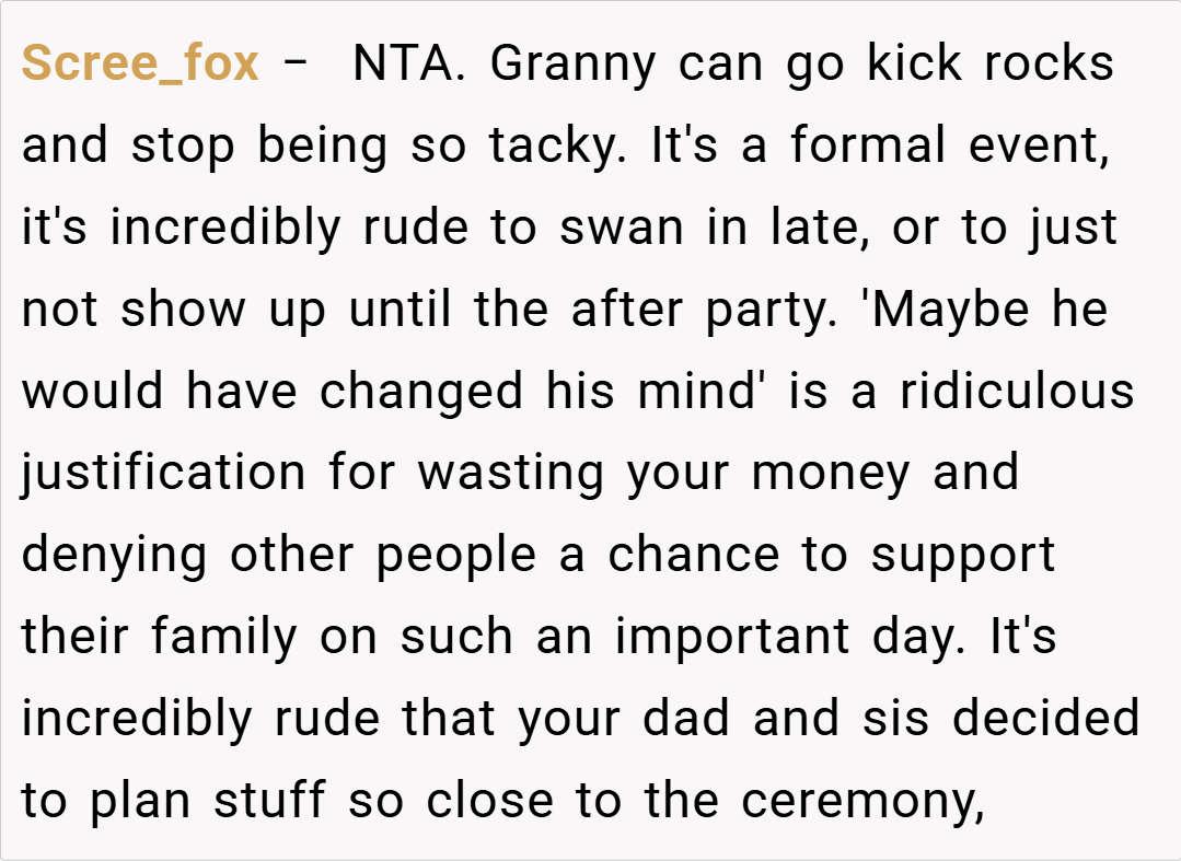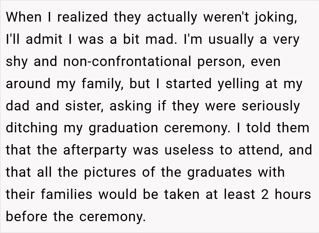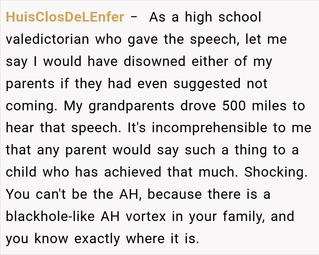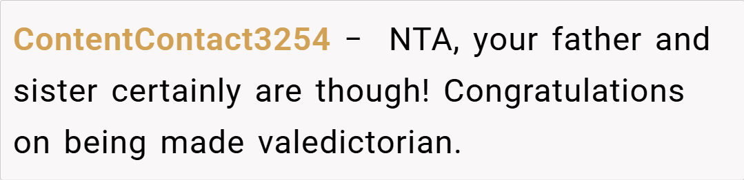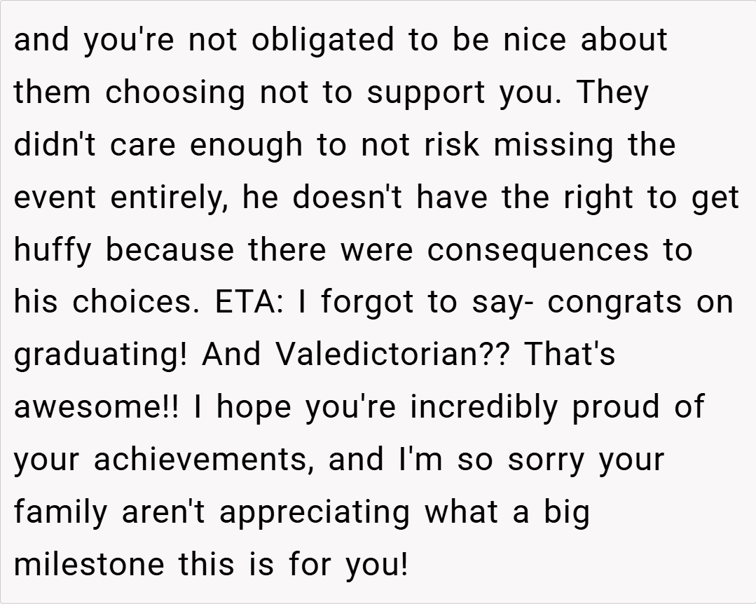 The comments are unanimous in their support for the daughter’s actions. Many express shock that her dad and sister would choose a sleepover over a graduation ceremony, with some even calling their plans disrespectful. The prevailing sentiment is clear: when it comes to celebrating major accomplishments, presence matters. Friends and fellow Redditors applaud her for standing up for herself, noting that such milestones are not to be compromised by half-hearted family attendance.