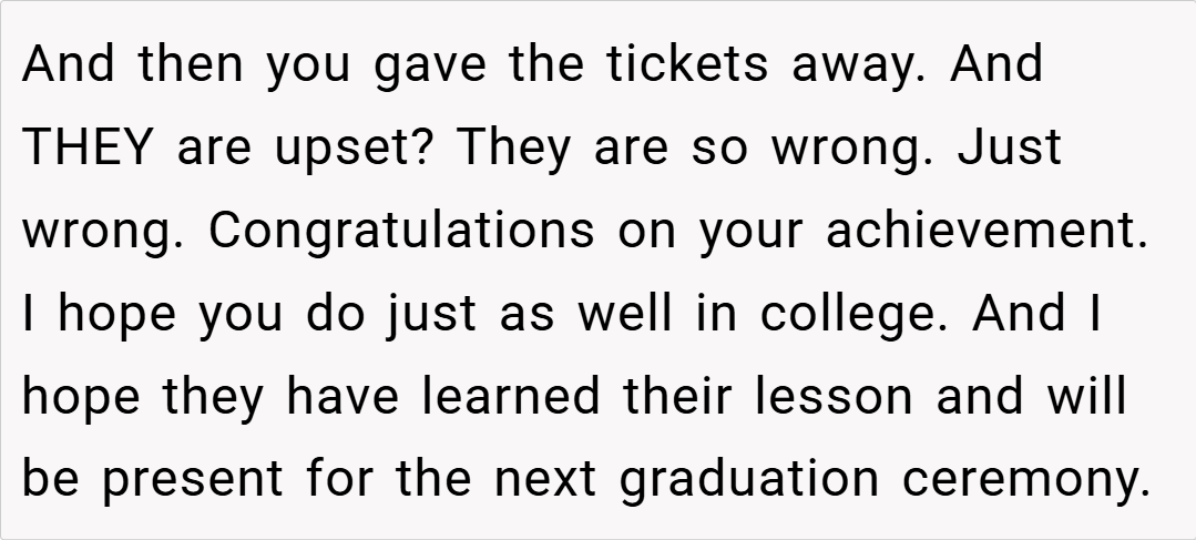 Ultimately, if family members choose not to invest in celebrating important milestones, their absence becomes a natural consequence of their own decisions. By reclaiming control over the celebration, the daughter is effectively communicating that her success deserves full support—not lukewarm participation.