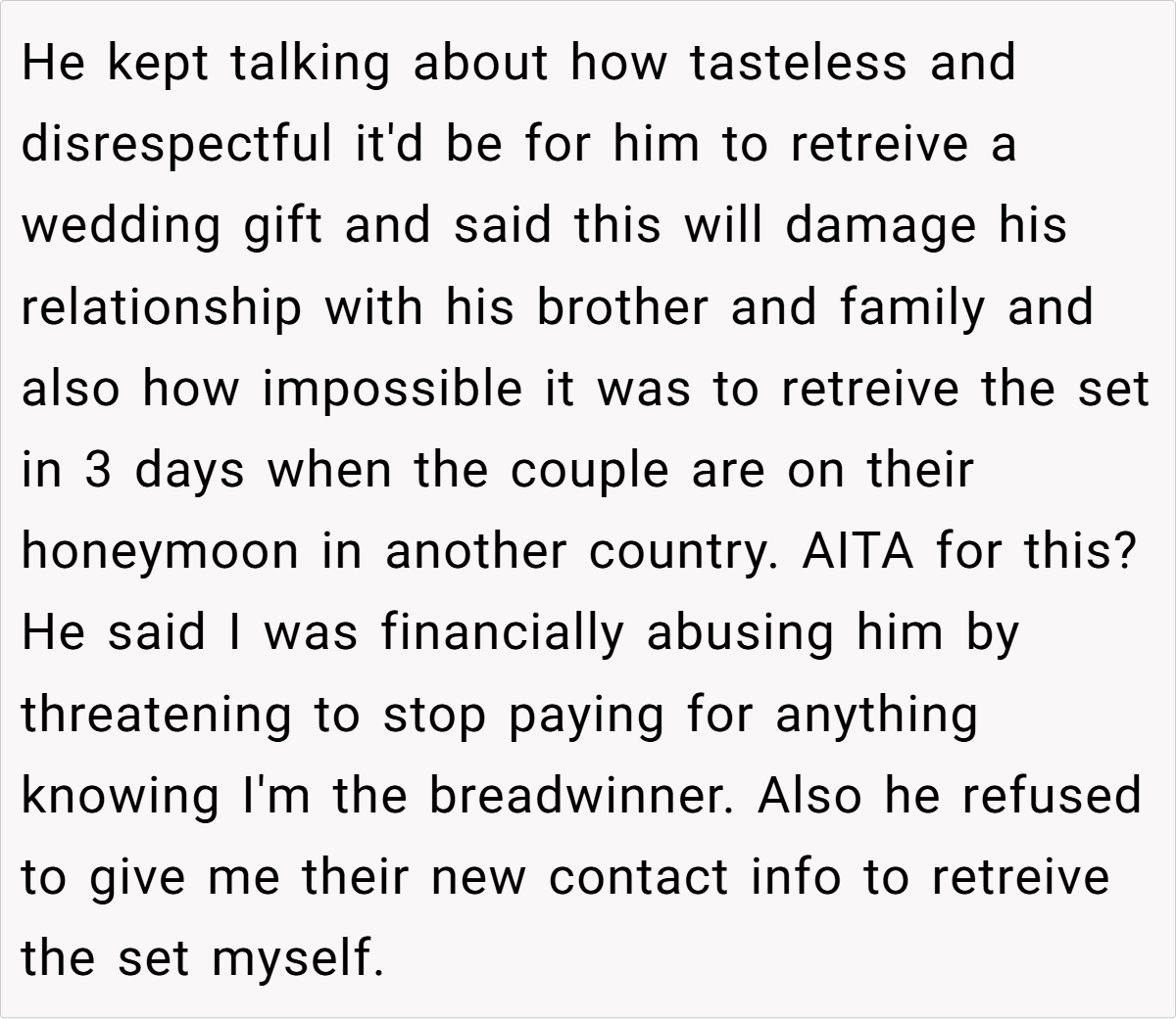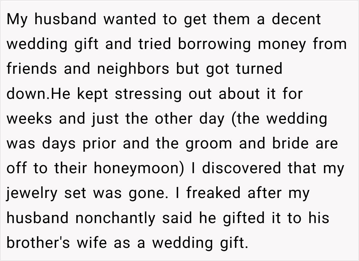 ‘ AITA – For giving my husband only 3 days to return my jewelry set that he he gave his brother’s wife as a wedding gift?’