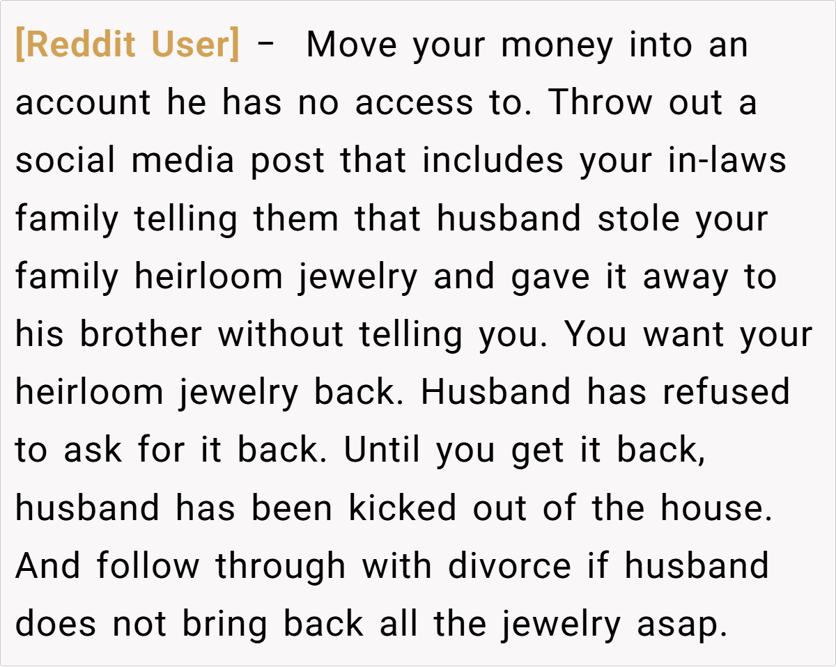 In a marriage, shared assets are meant to symbolize unity and mutual respect—but sometimes, they become flashpoints for deeper conflicts. This story highlights a situation where a cherished family jewelry set, steeped in both monetary and sentimental value, turned into a bone of contention. The wife, who cherishes the heirloom, discovered that her husband had given the set away as a wedding gift to his brother’s wife without asking her permission. Despite her earlier boundary clearly stating that her jewelry was off limits, her husband took it, sparking a fierce confrontation. When she discovered her key was missing and learned of his unilateral decision, she set a firm ultimatum: return the jewelry within three days or face drastic financial repercussions.