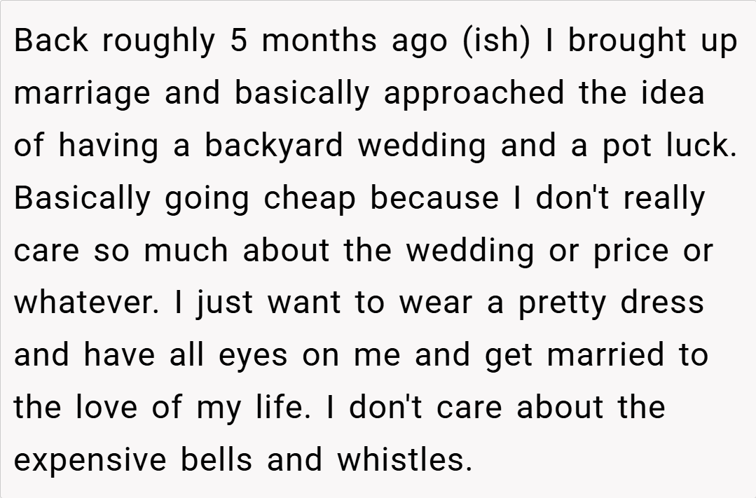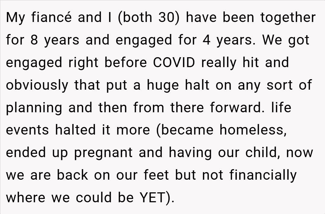 Despite their long-term commitment and shared experiences, including overcoming homelessness and welcoming a child, recent events have led her to question the future of their relationship. After overhearing her fiancé make dismissive remarks about marriage to his friends and expressing reluctance to discuss wedding plans, she decides to return her engagement ring.