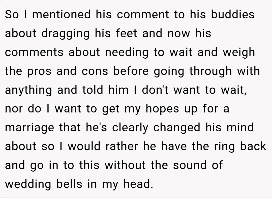 ‘ AITA for giving my ring back after my fiancé made a comment to his guy friends regarding why we haven’t gotten married?’