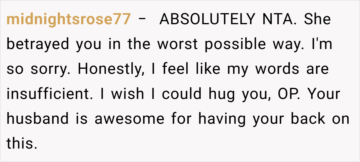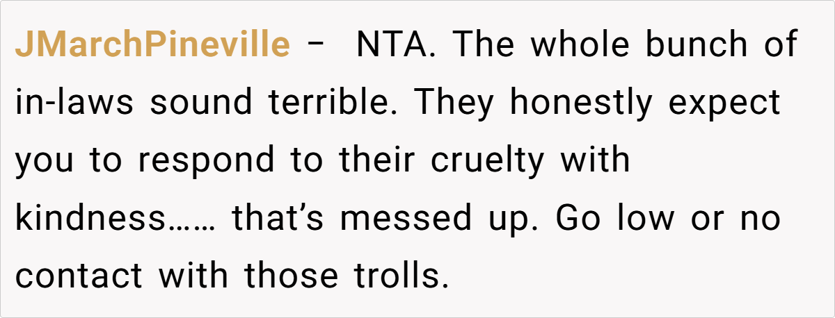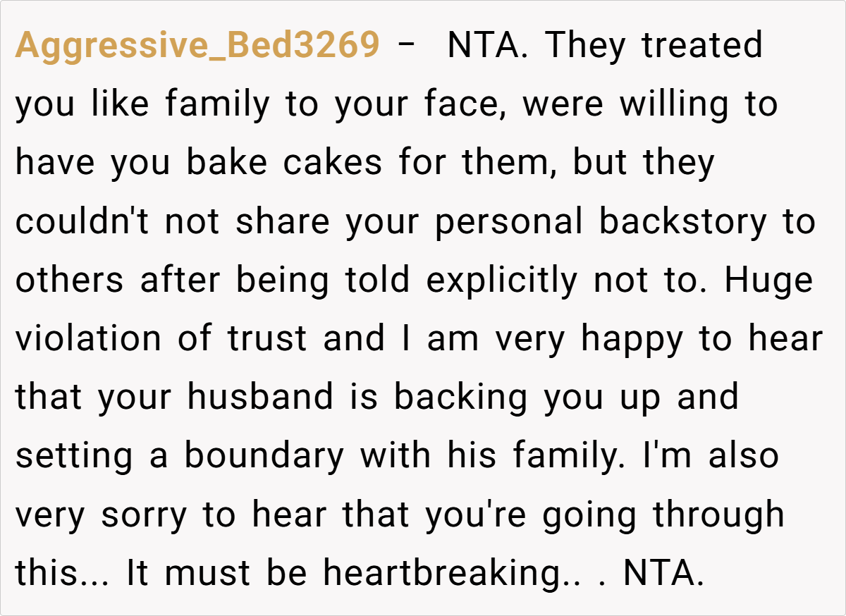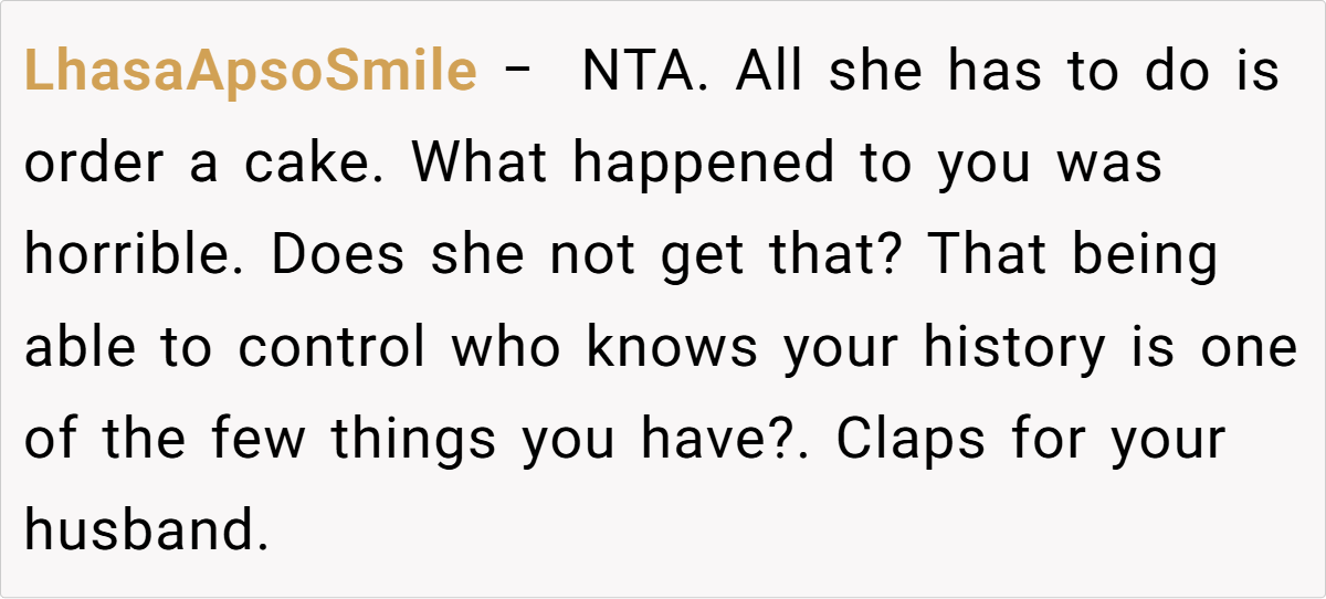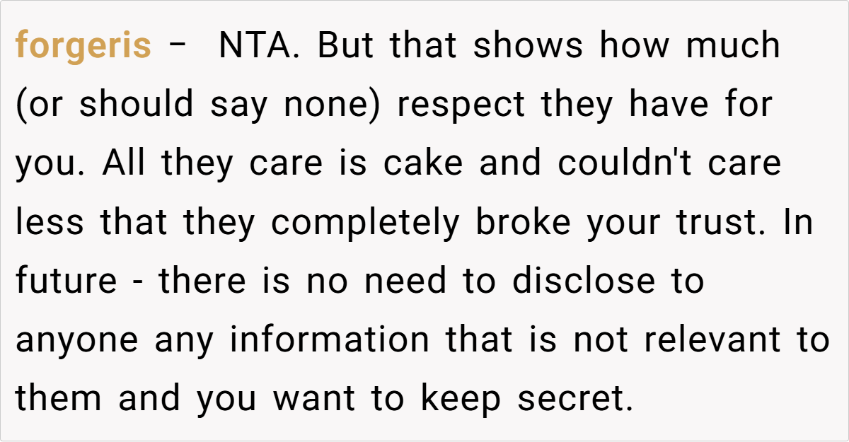 The online community overwhelmingly supports her stance. Commenters have remarked that if family members feel entitled enough to gossip about your painful past, they don’t deserve the fruits of your labor. One user wrote, “Your history is not theirs to share, and if they can’t keep a secret, they can get a cake from Walmart.” Others echoed sentiments of empowerment and self-respect, urging her to “protect your peace at all costs.”