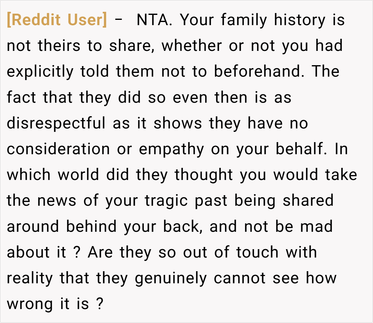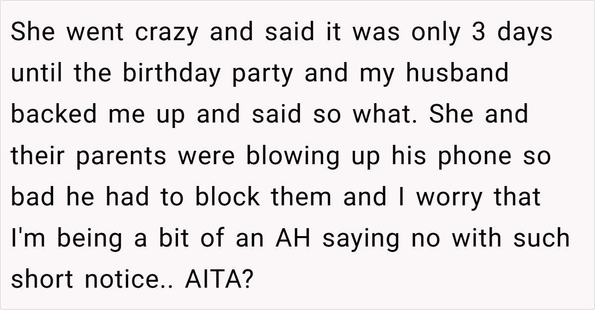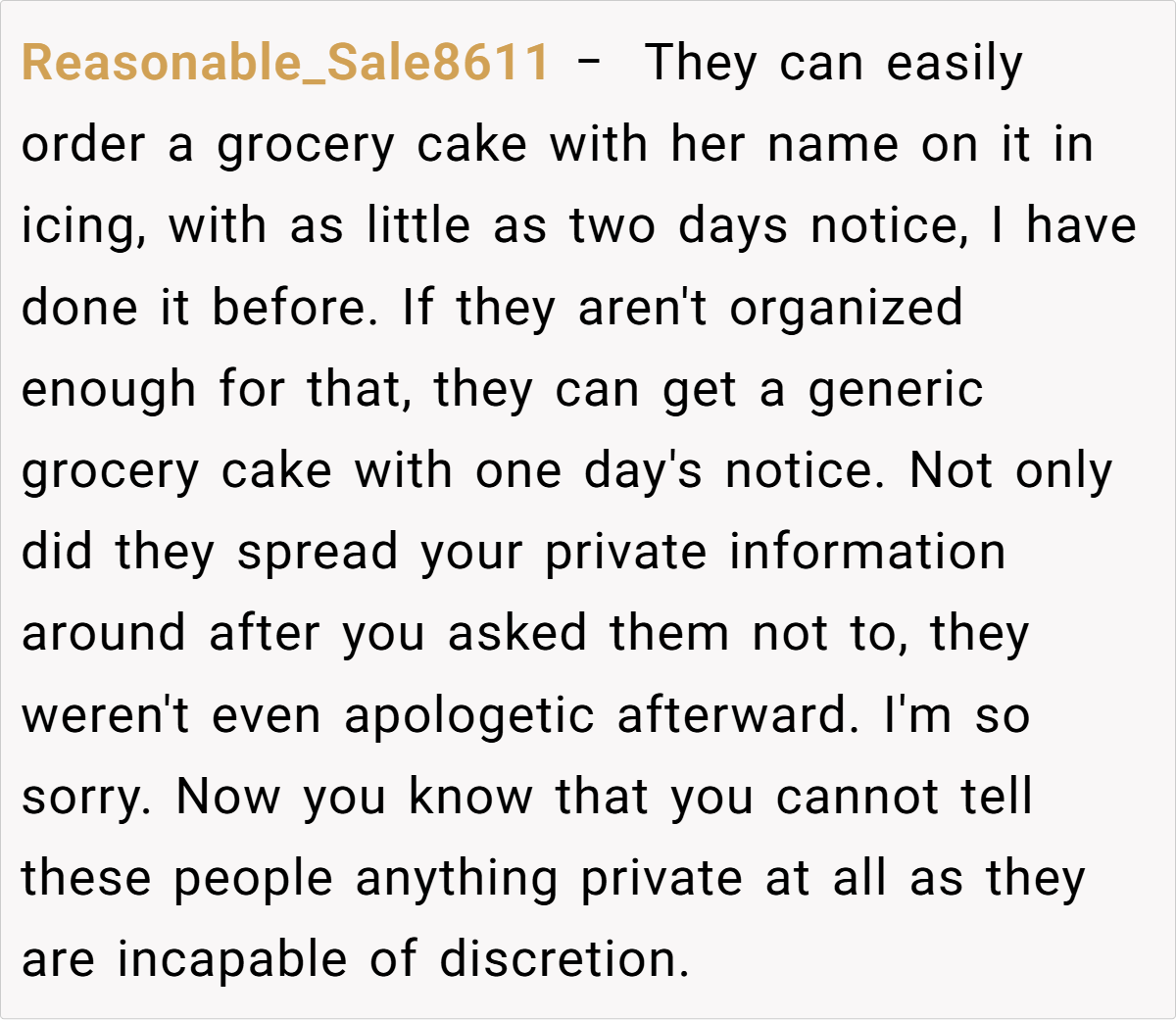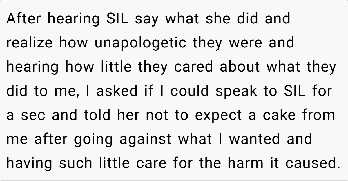 Ultimately, this painful incident is a reminder that true family support involves respect, discretion, and empathy. The baker’s decision to cancel the cake order isn’t an overreaction—it’s a stand for her personal dignity and a refusal to allow her past to be weaponized. While three days might seem like short notice to some, it’s clear that emotional boundaries are far more critical than any deadline.