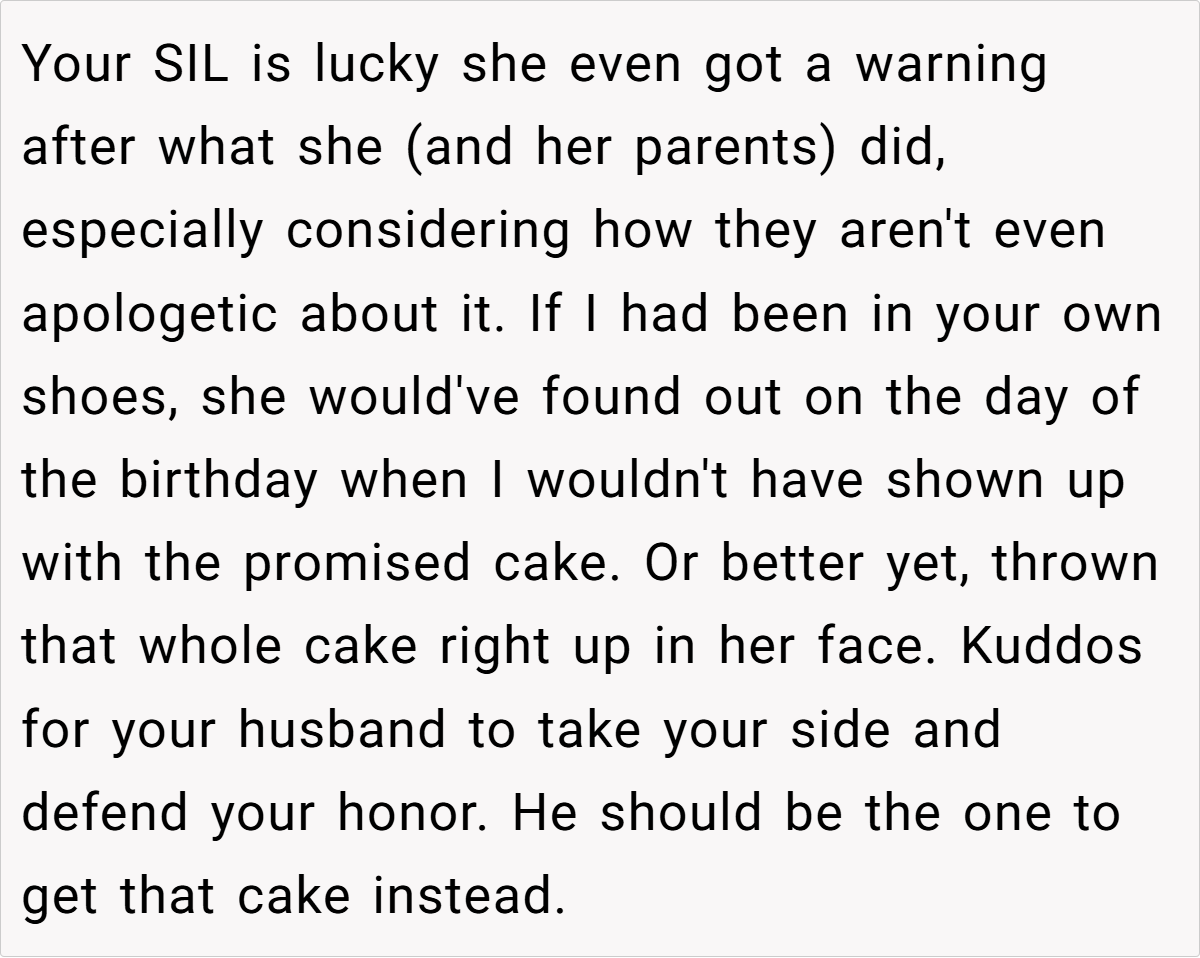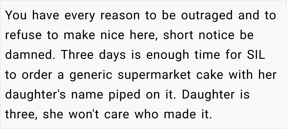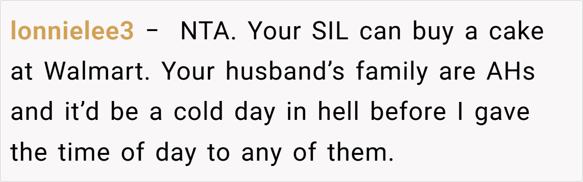 This incident also reveals a broader issue: the misconception that family relationships automatically negate professional costs. In healthy relationships, clear communication about personal boundaries is essential. The baker’s decision to cancel the cake order, even on short notice, reflects a necessary act of self-respect rather than ingratitude. Her husband’s unwavering support further highlights that standing up for oneself is not only justified—it’s indispensable for long-term emotional wellbeing.