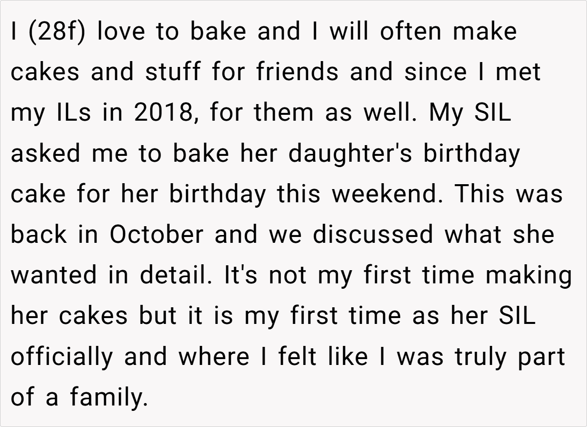 ‘AITA for giving my SIL three days notice that I would no longer make a cake for her daughter’s 3rd birthday after finding out she and her parents told others my history?’