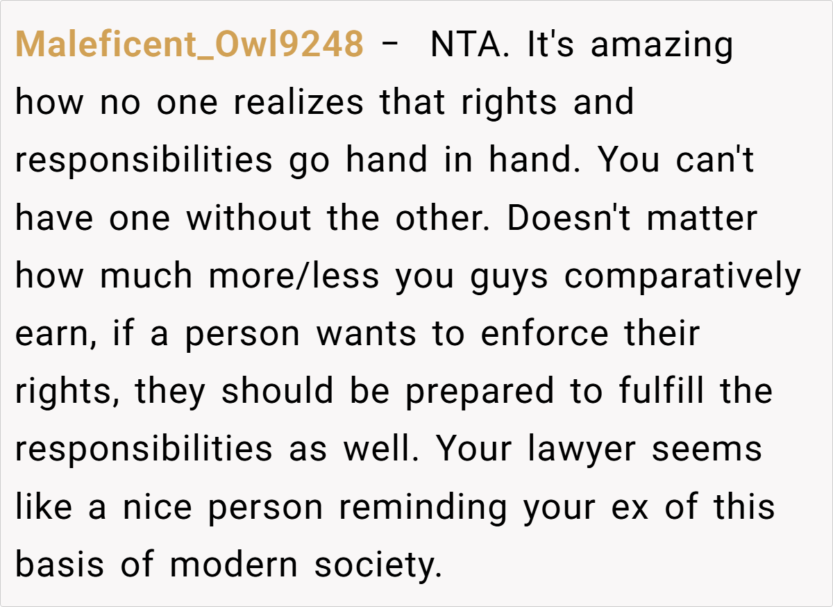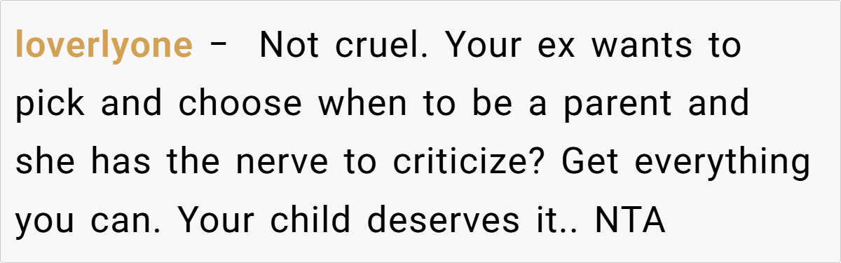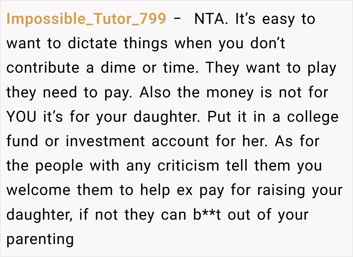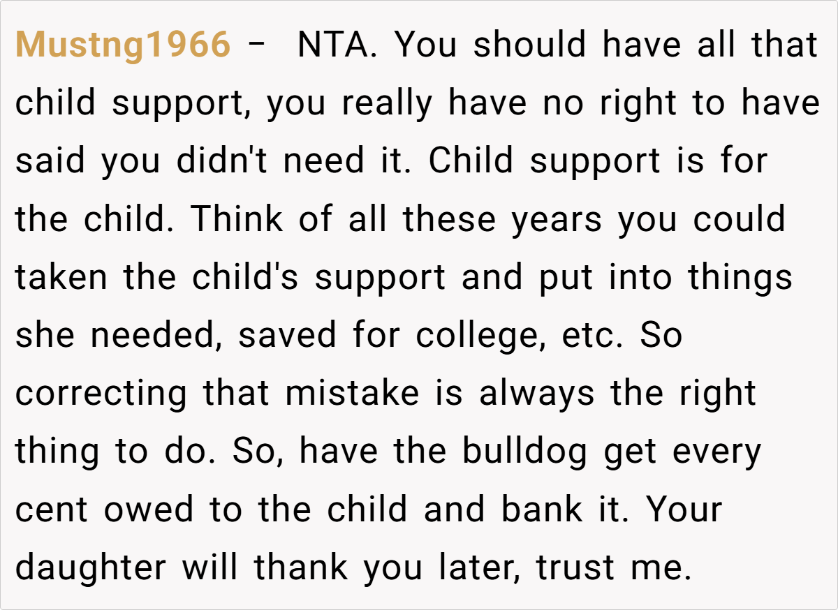 The majority of responses lean toward support for his decision. Many argue that if his ex-wife wishes to meddle in his parenting, then she should also contribute financially to his daughter’s upbringing. Commenters emphasized that child support is intended for the child, not as a personal favor to one parent, and that this legal strategy levels the playing field when disputes arise.