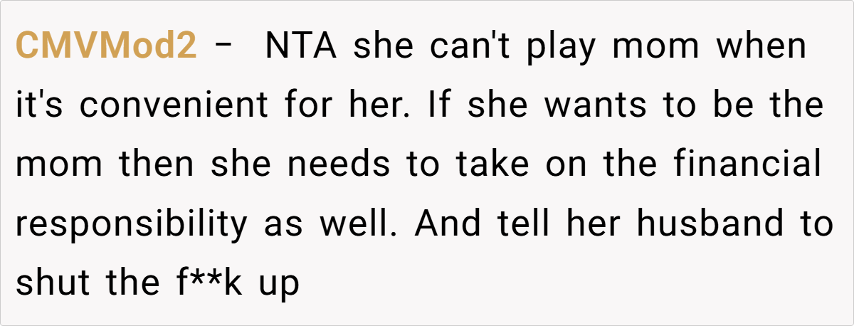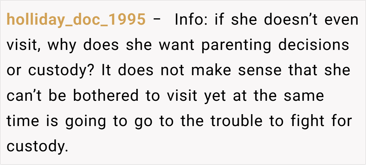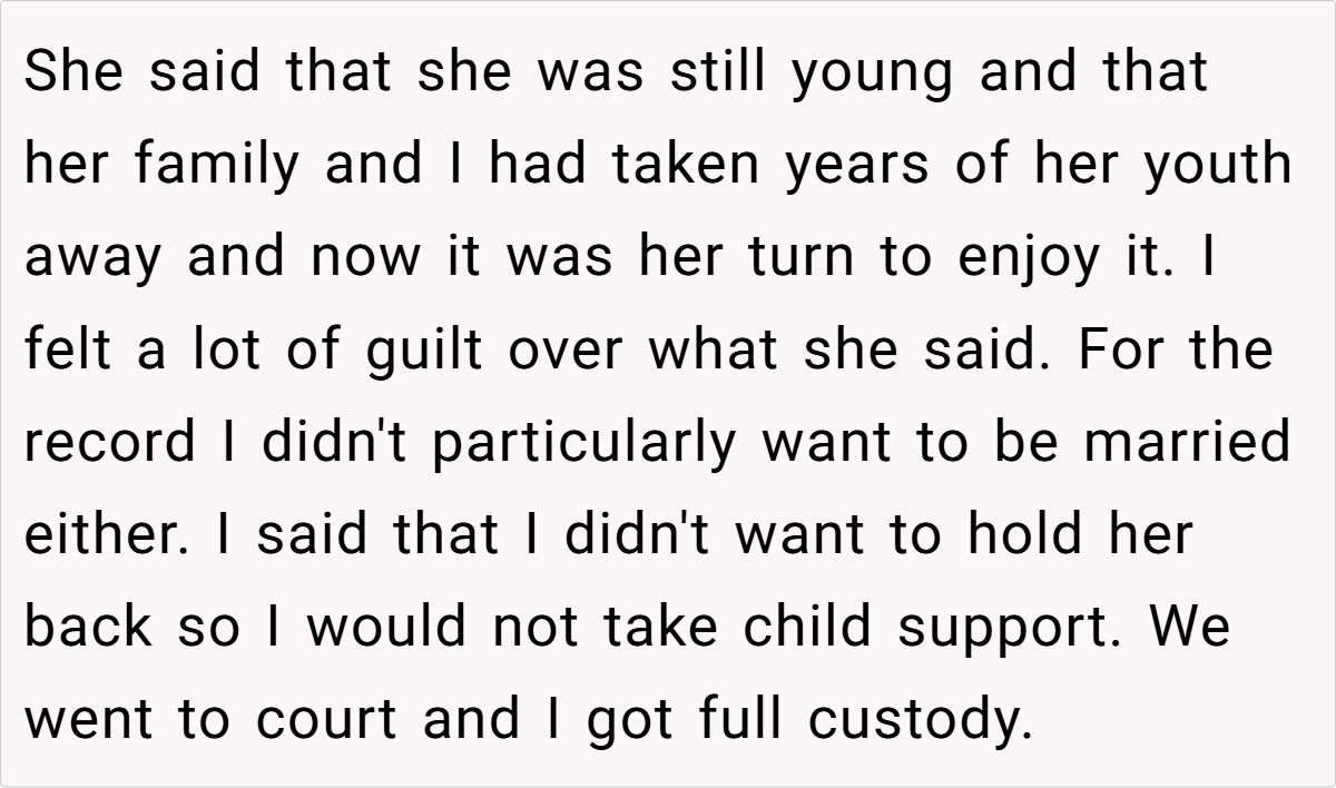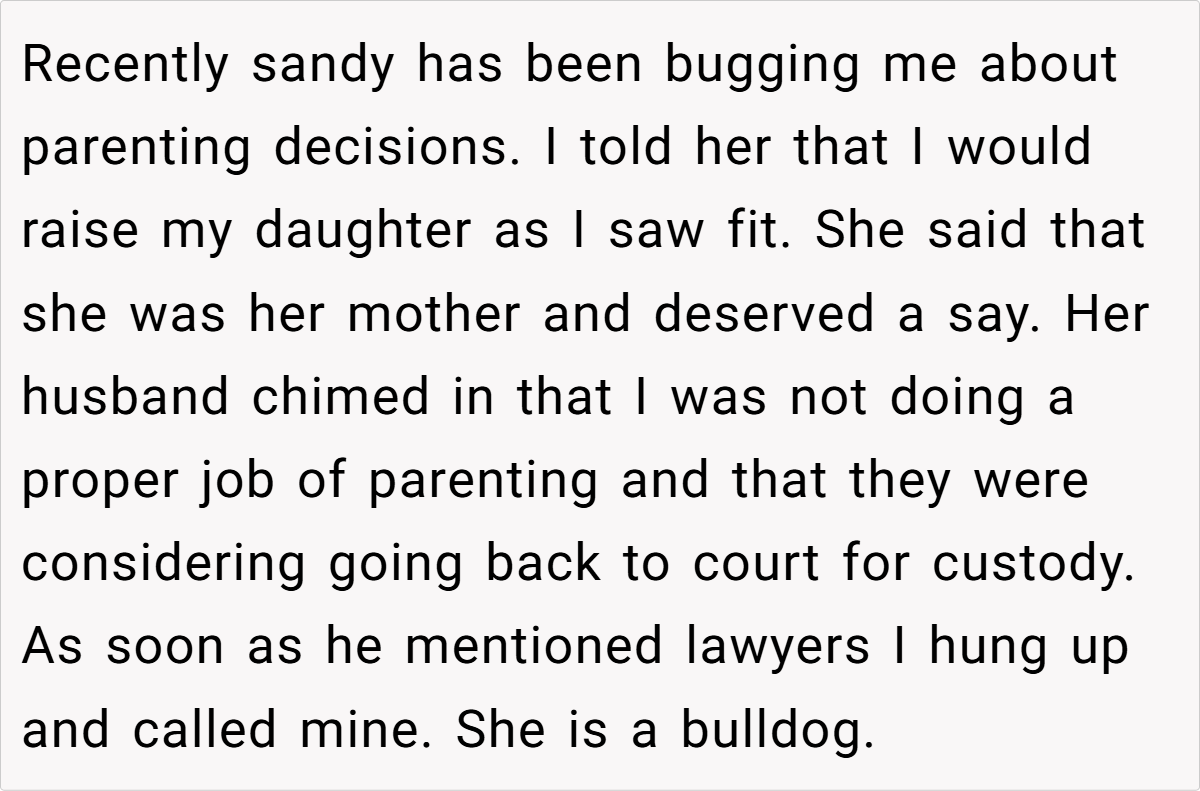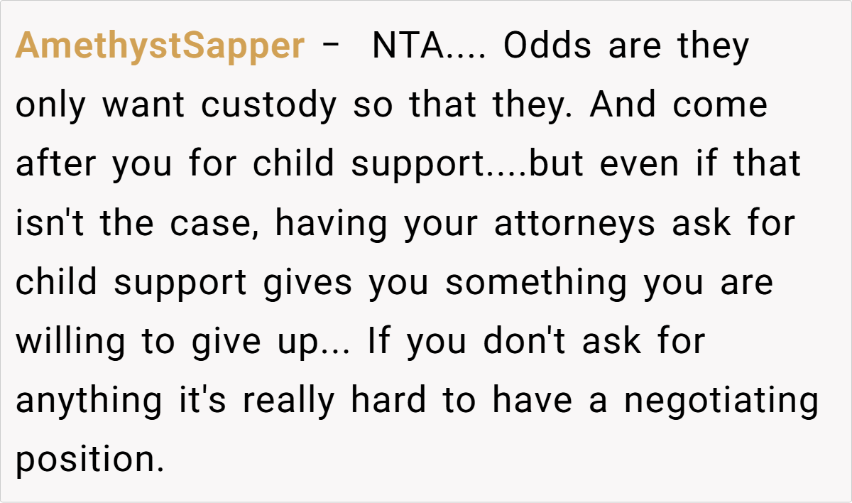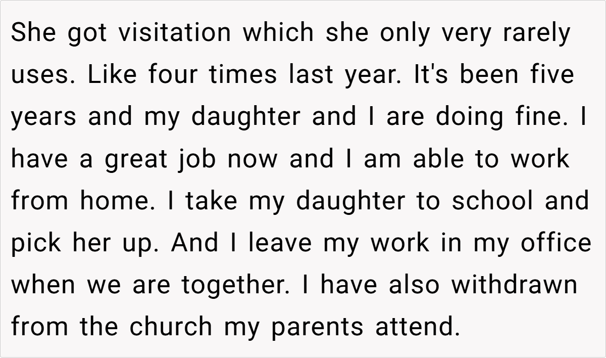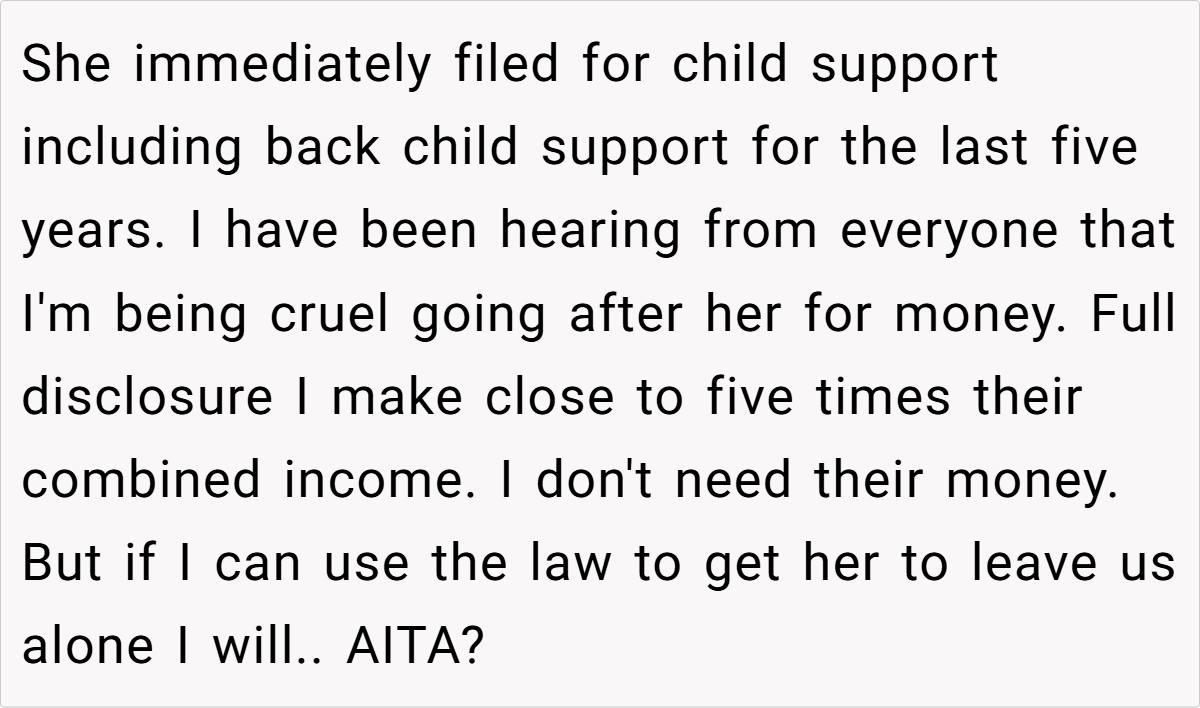 Now, five years down the road, while he and his daughter thrive, his ex-wife and her husband are demanding a say in how their daughter is raised. In response, he’s chosen to enforce the original promise through the courts, arguing that any financial contribution should be strictly for his daughter’s benefit. This bold move has sparked controversy, with opinions divided on whether he’s acting in the child’s best interests or letting personal pride override past commitments.