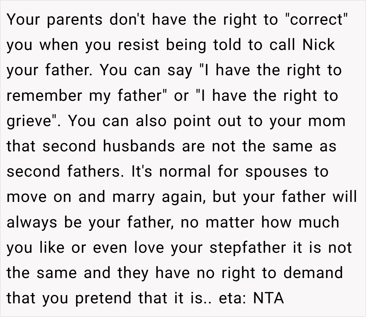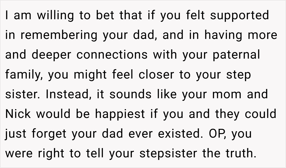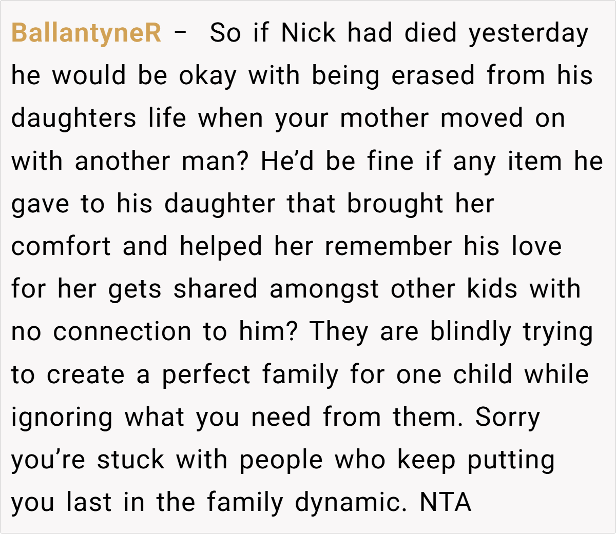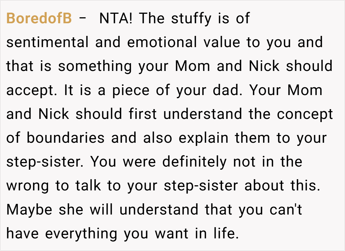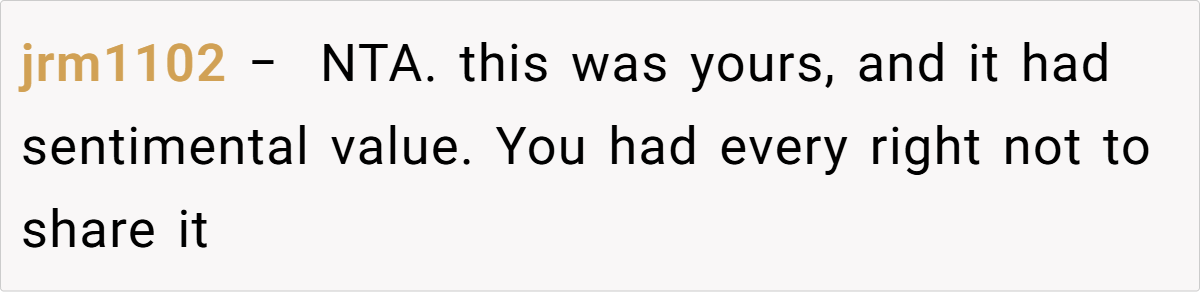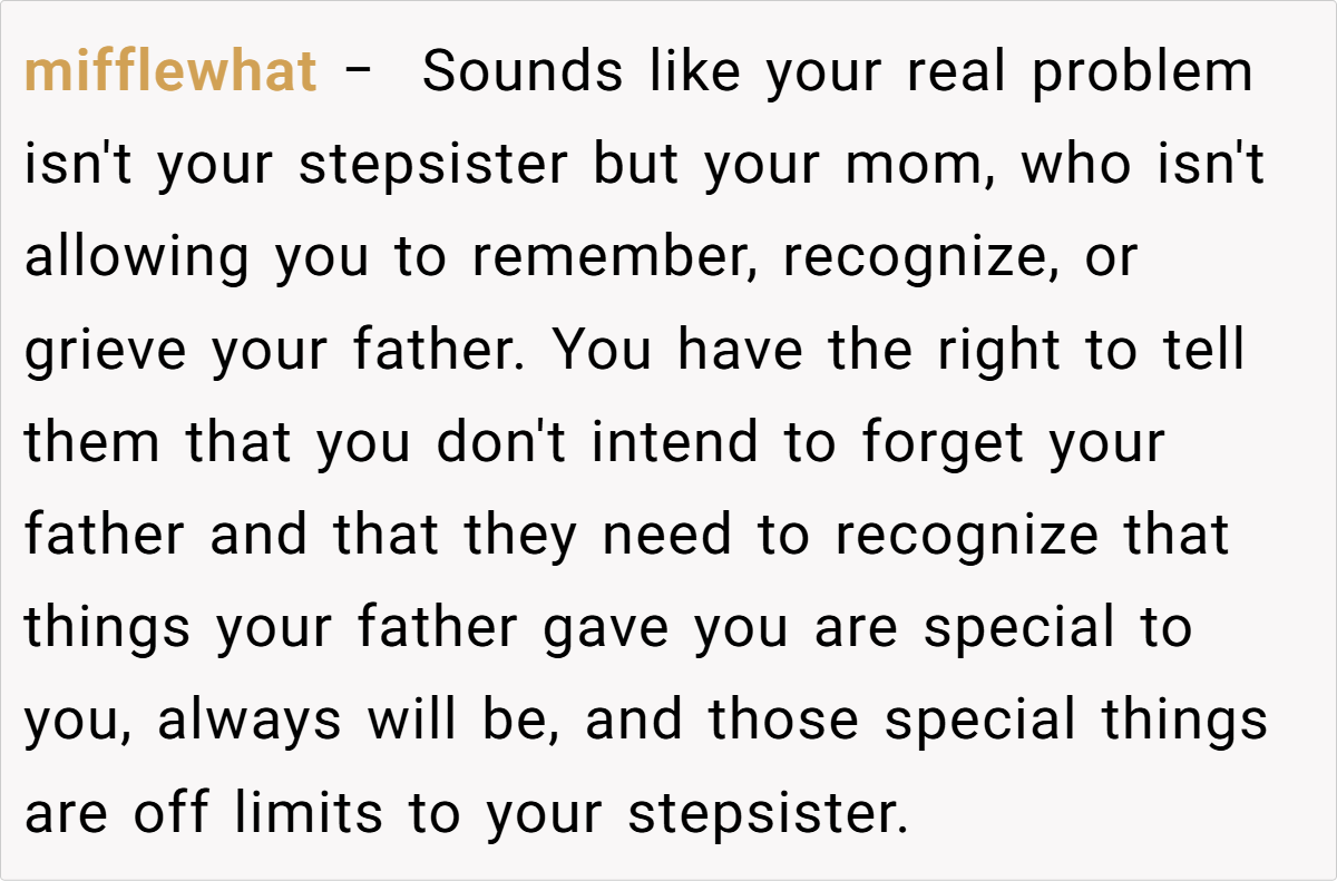 The Reddit community has largely rallied behind him. Commenters praised his firm stance on preserving an irreplaceable memento of his father, emphasizing that his stepsister needed to understand that not every possession is meant to be shared. Many noted that the responsibility for teaching proper boundaries lies with the adults—and that his mother and stepfather should have done a better job of mediating the situation rather than forcing a “sharing” mentality.