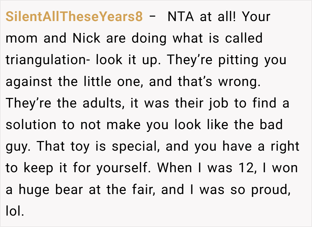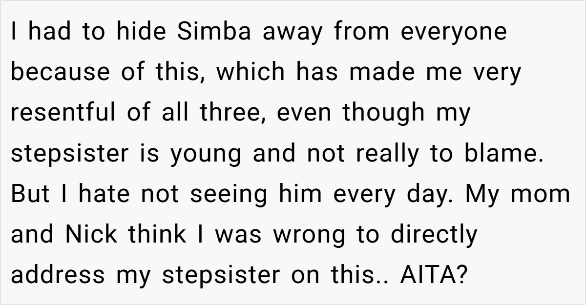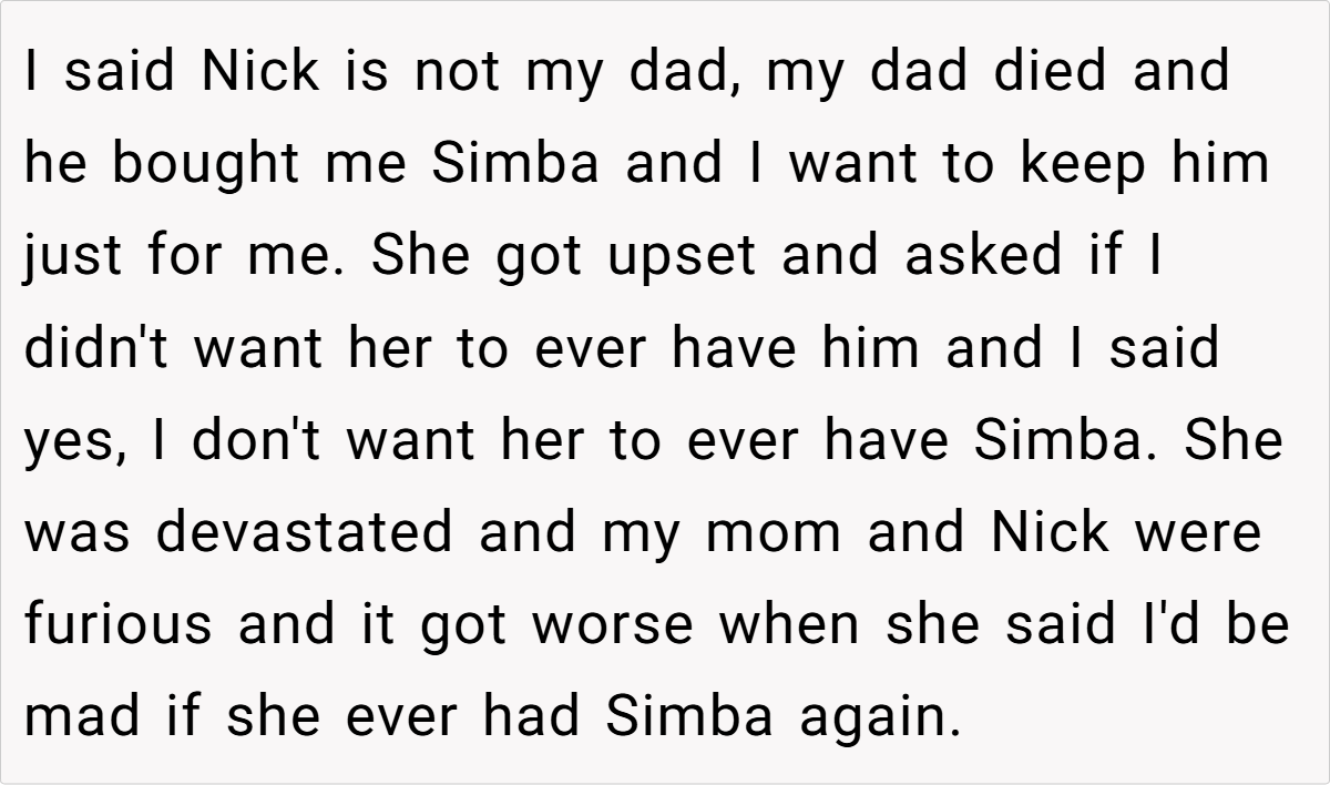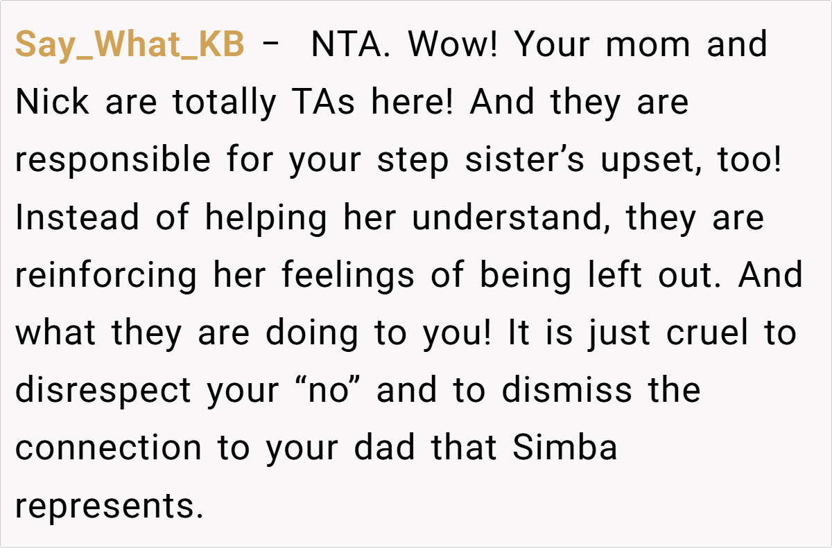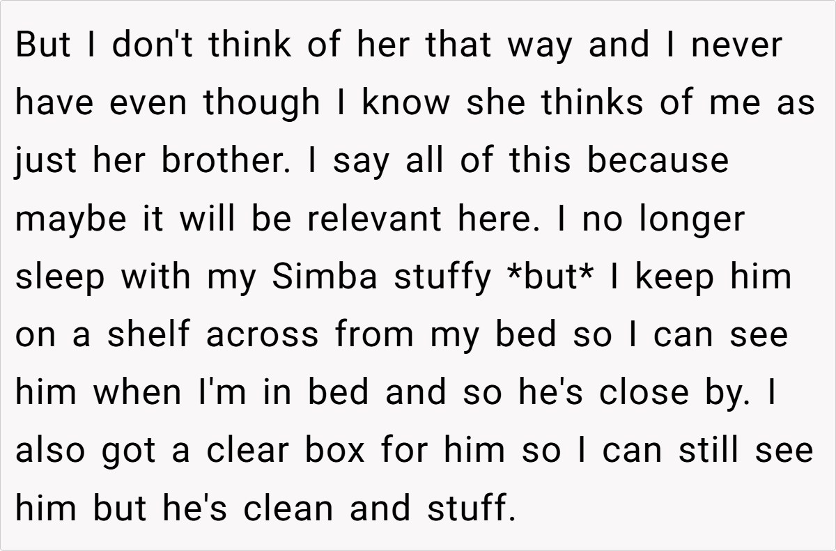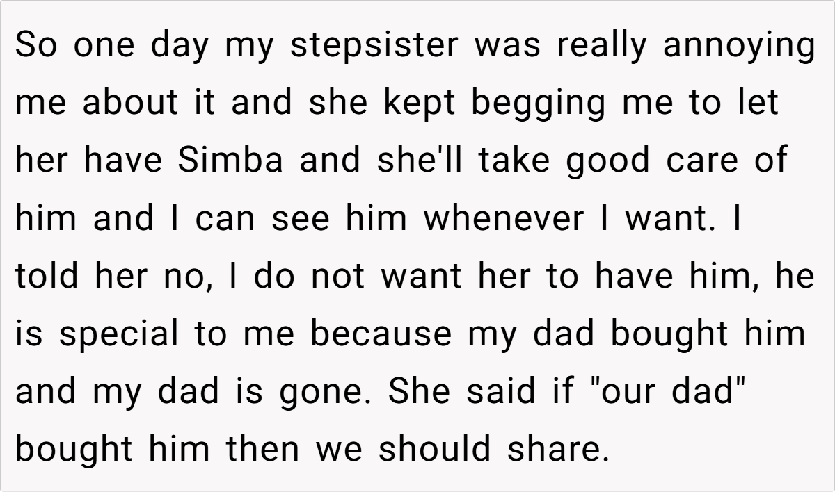 When his stepsister, who has been overly affectionate and persistent in her desire to claim the stuffy, continued to pester him despite his clear refusal, he finally took a stand. With family members insisting on sharing and erasing the boundaries that honor his past, he directly told his stepsister that Simba was off-limits—a decision that sparked anger and accusations of being unkind. The question now arises: was he in the wrong for setting such a firm boundary?