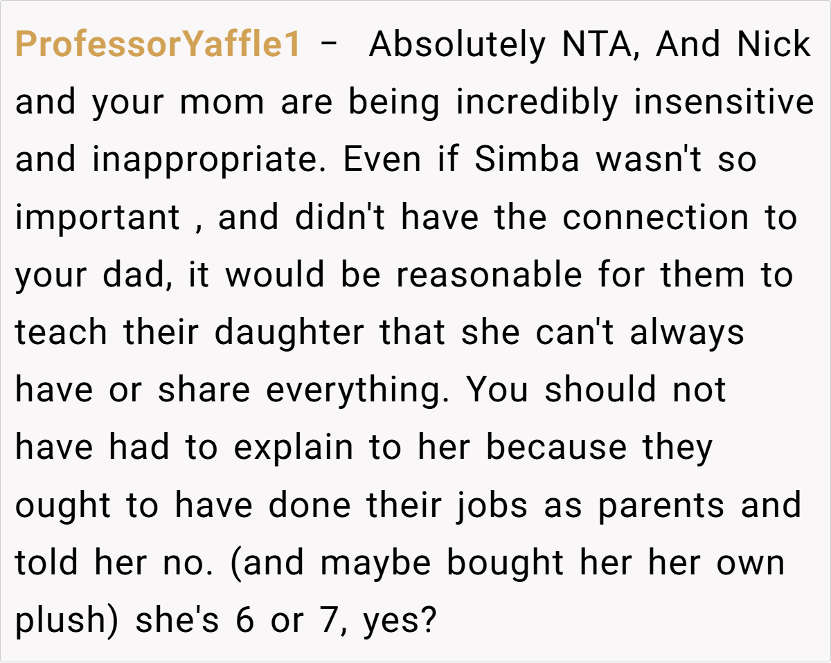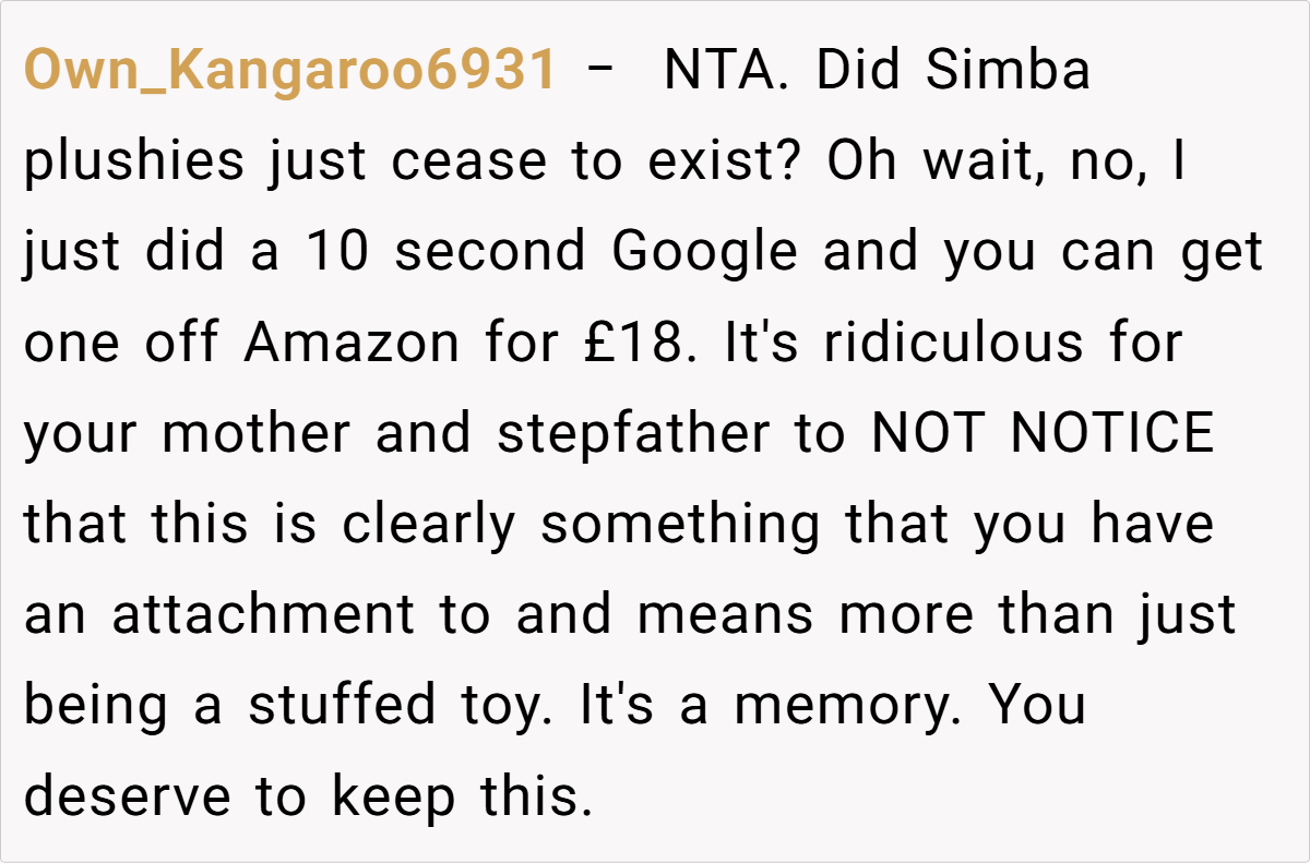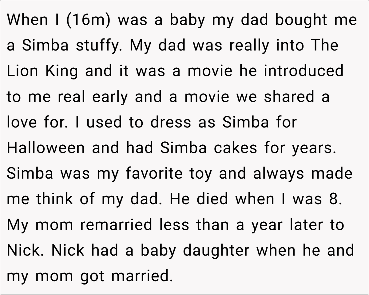 Family relationships can be as complicated as they are heartfelt—especially when it comes to treasured memories from our past. For one 16-year-old, a beloved Simba stuffy isn’t just a toy; it’s a priceless memento of his late father, a reminder of the bond they shared over a movie that defined their relationship. Despite the fact that he no longer sleeps with it, he keeps Simba carefully displayed on a shelf as a constant connection to his dad. This deep emotional significance makes the toy irreplaceable, even though others in the household don’t fully understand its value.