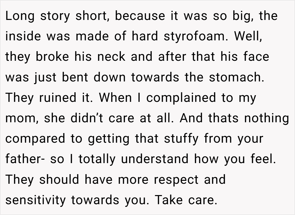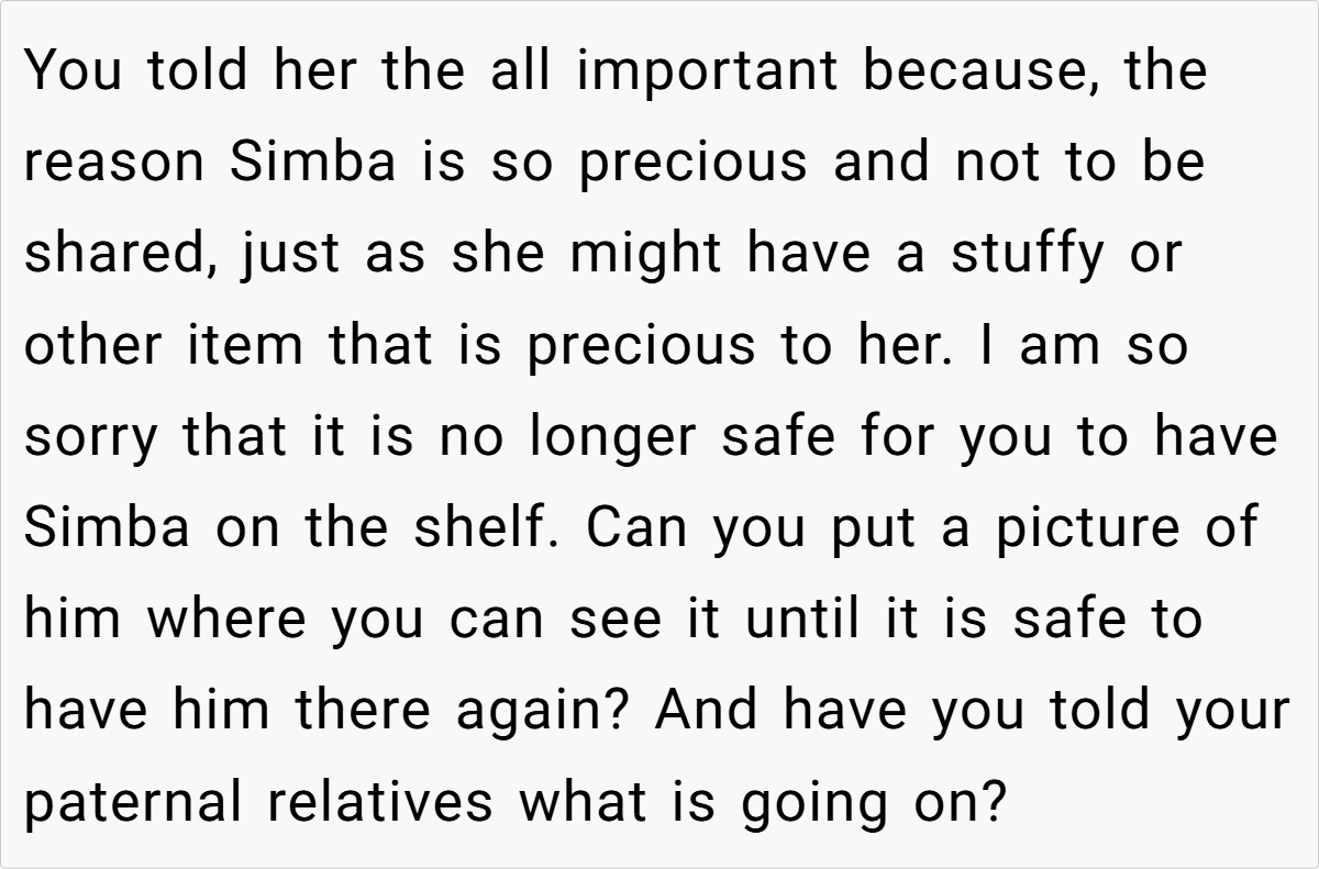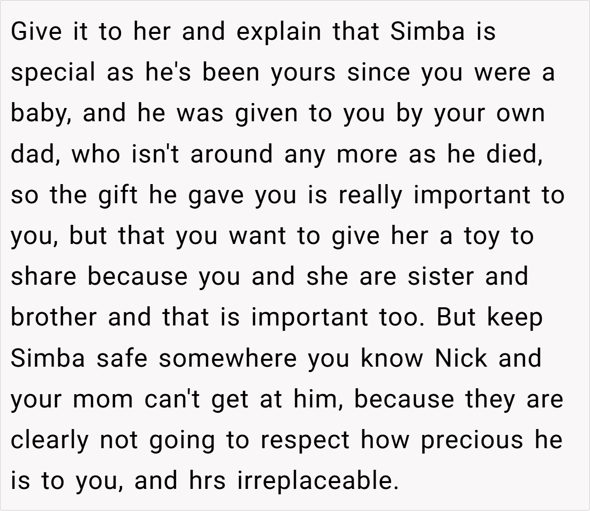 Family relationships can be as complicated as they are heartfelt—especially when it comes to treasured memories from our past. For one 16-year-old, a beloved Simba stuffy isn’t just a toy; it’s a priceless memento of his late father, a reminder of the bond they shared over a movie that defined their relationship. Despite the fact that he no longer sleeps with it, he keeps Simba carefully displayed on a shelf as a constant connection to his dad. This deep emotional significance makes the toy irreplaceable, even though others in the household don’t fully understand its value.