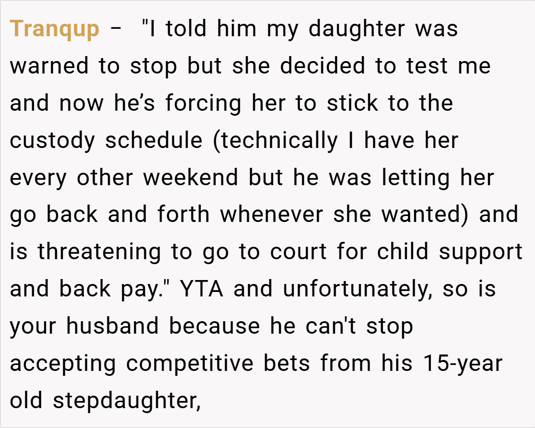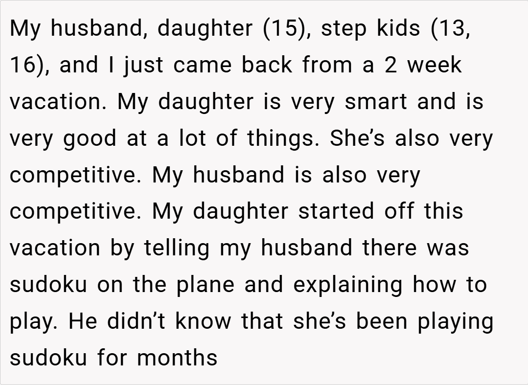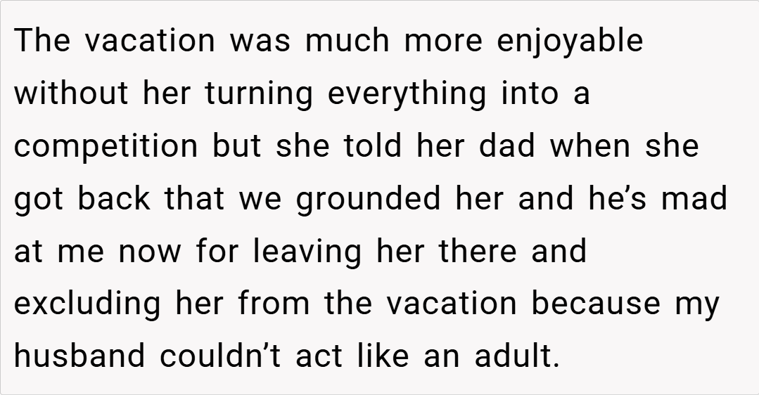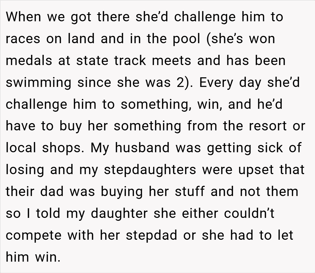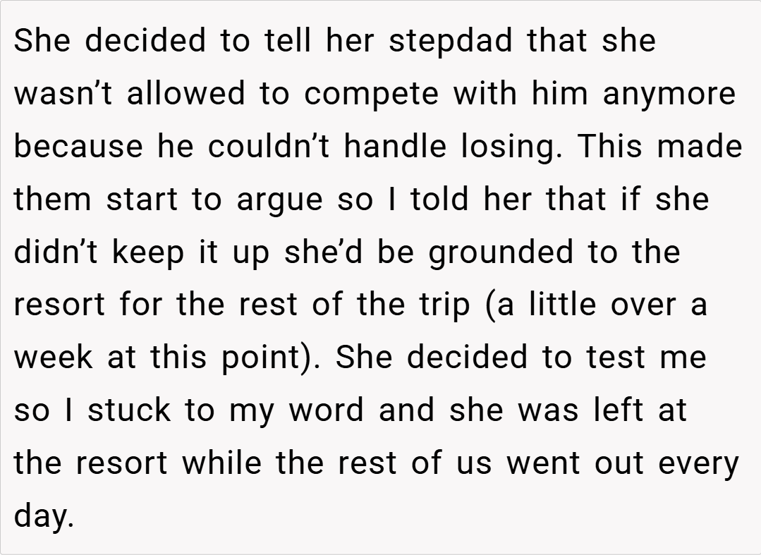 A family vacation, meant to be a time of relaxation and togetherness, took a sharp turn when competitive antics escalated into a full-blown conflict. During the trip, the daughter’s relentless challenges to her stepdad—who, despite being an adult, couldn’t resist the bait—turned every activity into a contest.