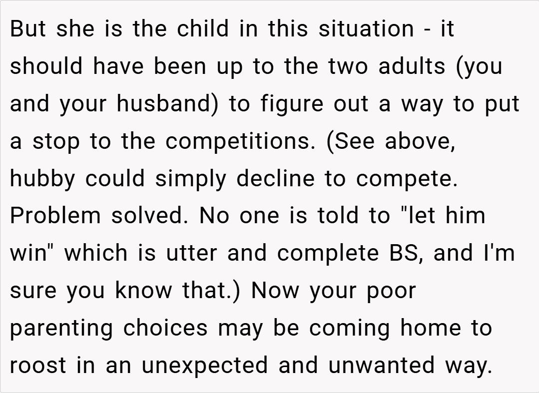 This incident raises important questions about the balance between enforcing discipline and modeling mature behavior in family dynamics. When does competitive behavior cross the line into creating an unhealthy environment for a child?