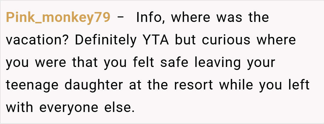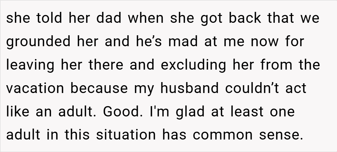 Others defended her stance, asserting that repeated disruptive behavior warranted a firm consequence, especially when it impacted the vacation for everyone else. The consensus revealed a deep concern over parental responsibility and the need for both adults to step up rather than placing the burden solely on the child.