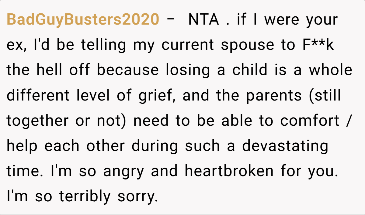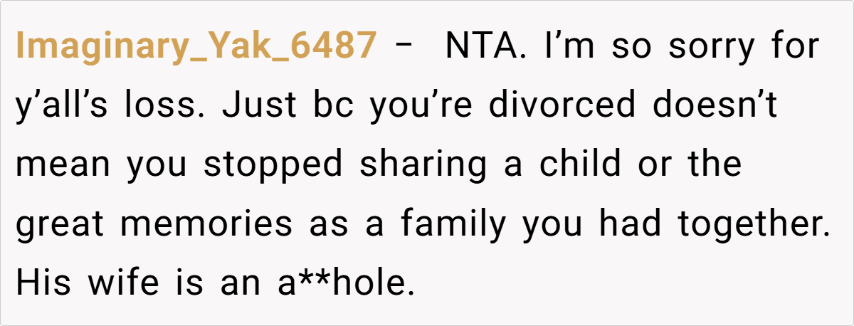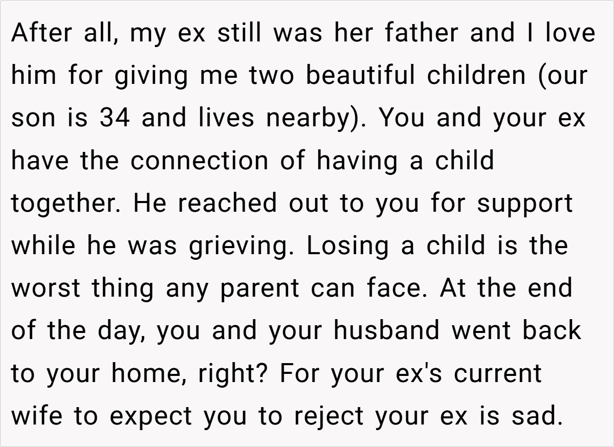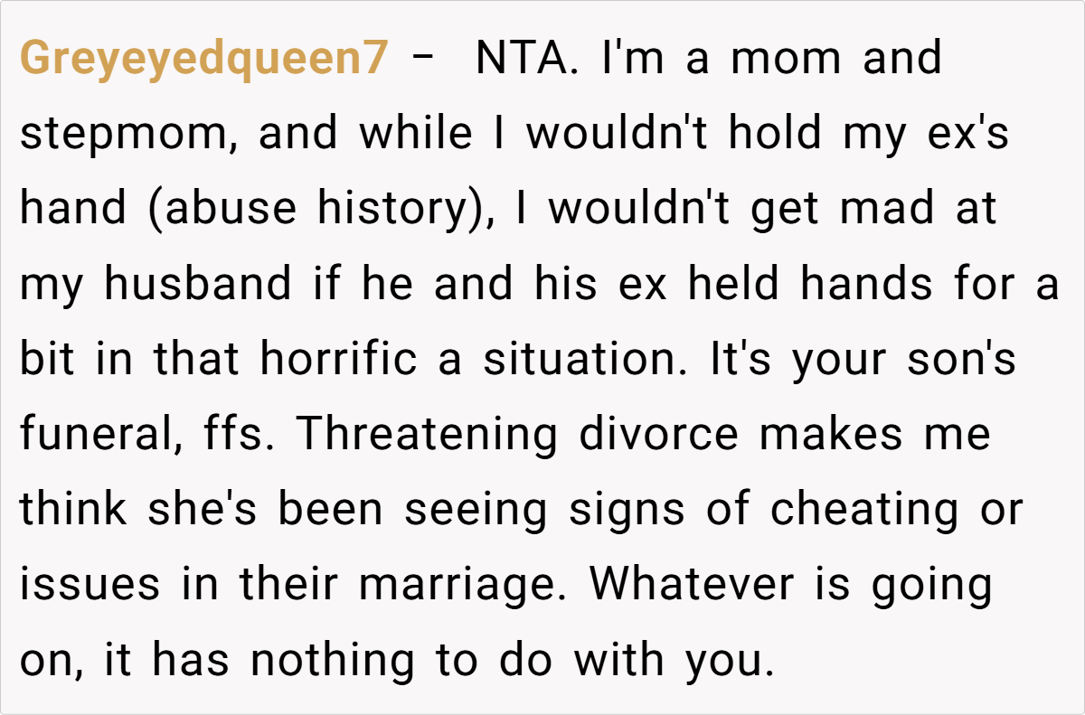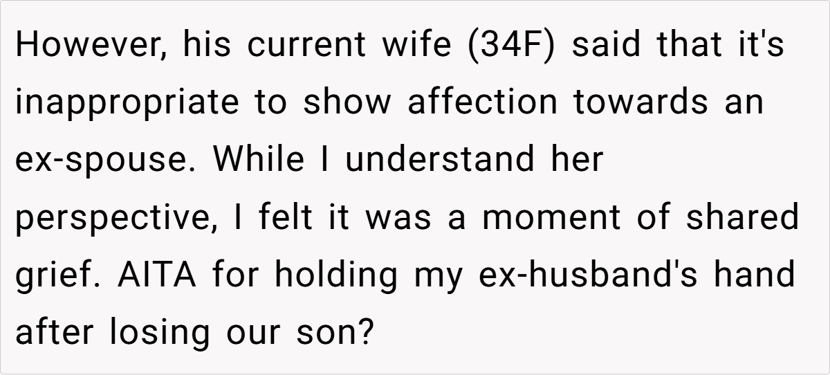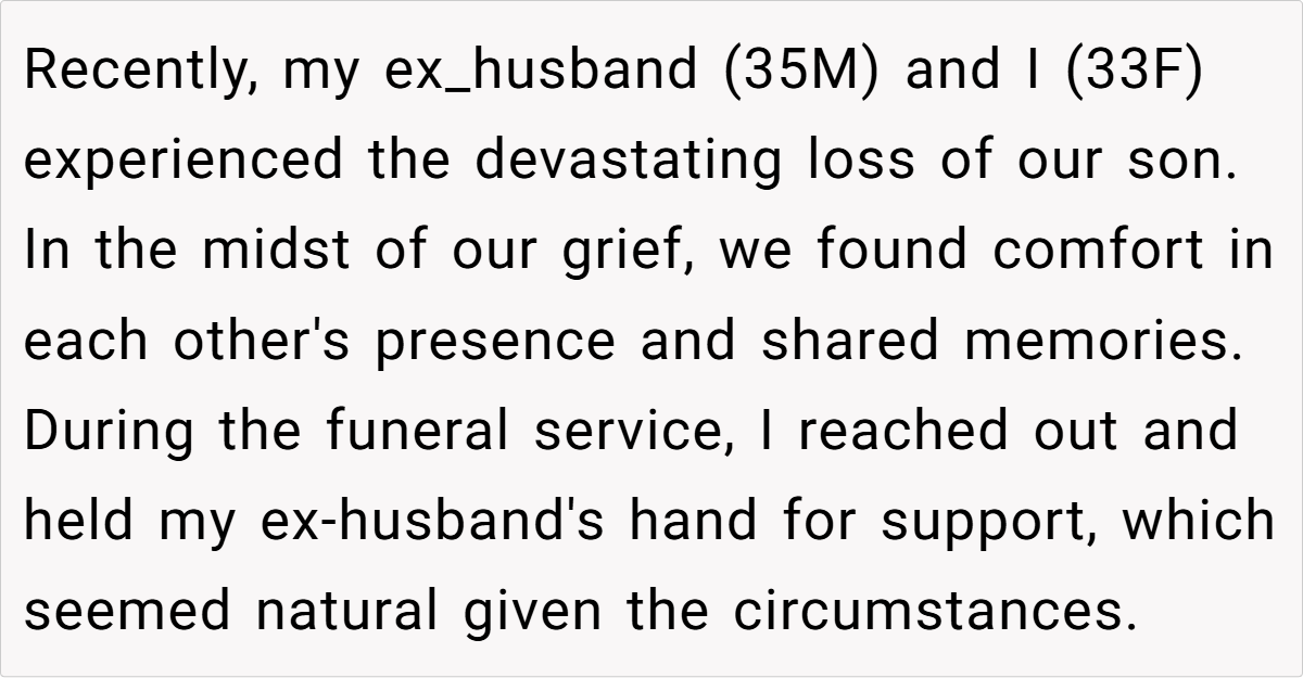 OP (33F) and her ex_husband (35M) recently lost their son. At the funeral, overwhelmed by grief, OP held her ex-husband’s hand for emotional support. His current wife (34F) later criticized this, claiming it was inappropriate to show affection toward an ex-spouse. OP wonders if she was in the wrong, though she felt it was a natural response in their shared grief.
