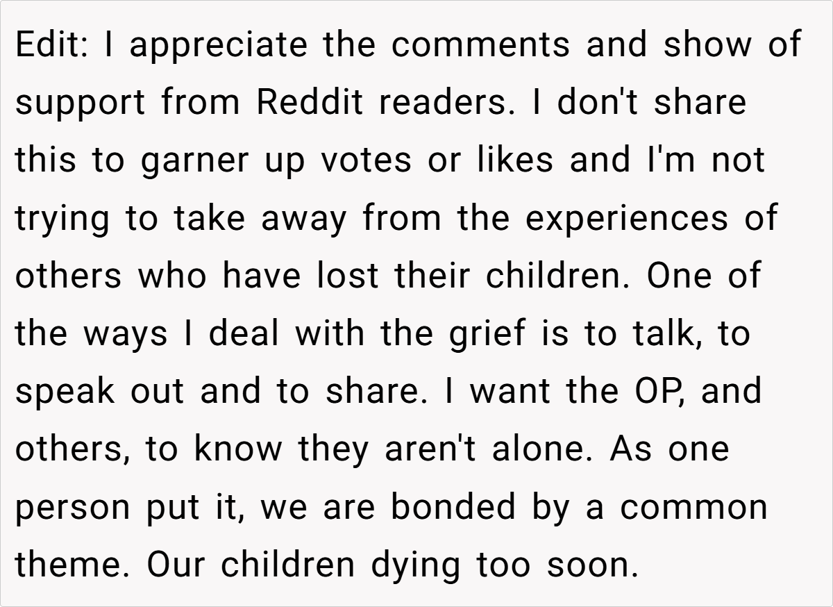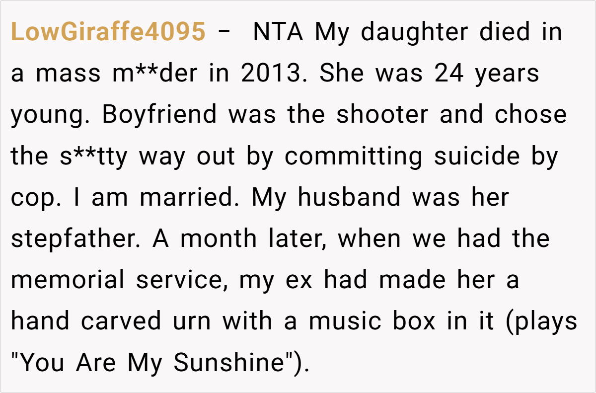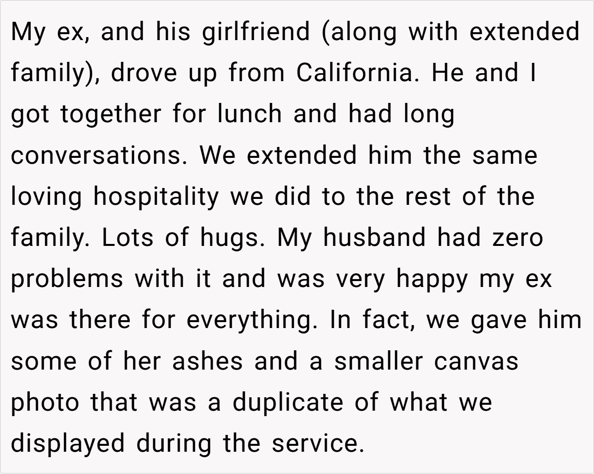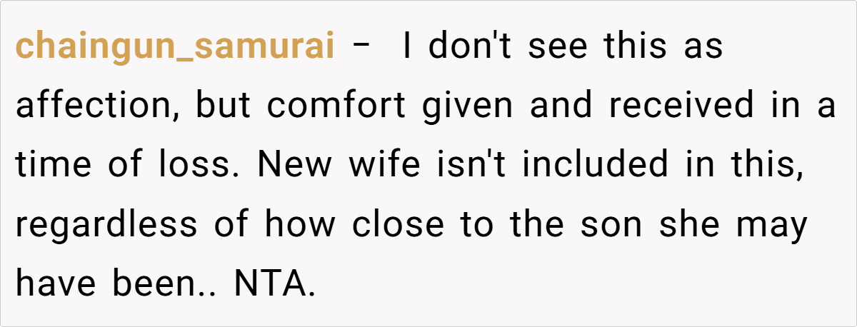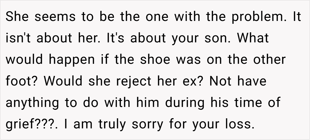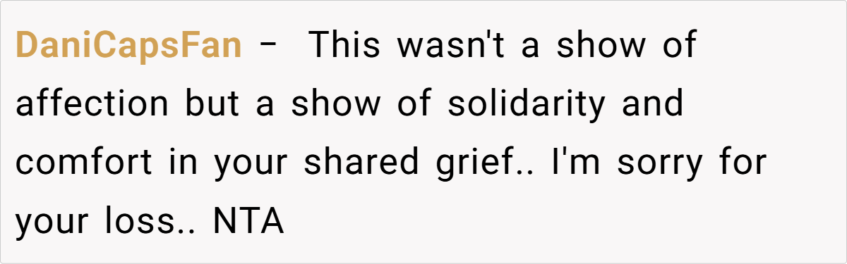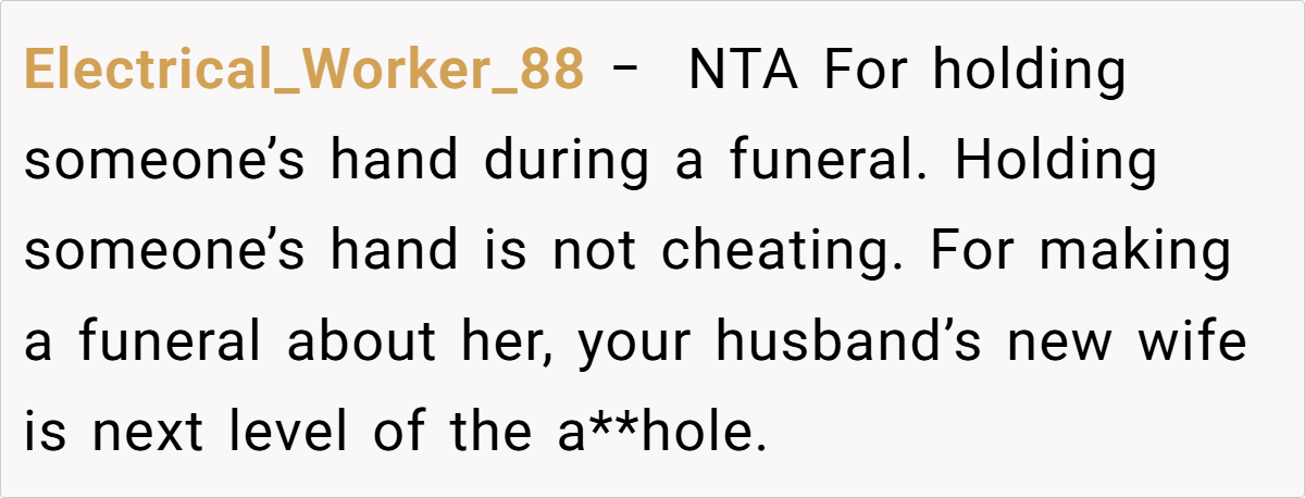 OP (33F) and her ex_husband (35M) recently lost their son. At the funeral, overwhelmed by grief, OP held her ex-husband’s hand for emotional support. His current wife (34F) later criticized this, claiming it was inappropriate to show affection toward an ex-spouse. OP wonders if she was in the wrong, though she felt it was a natural response in their shared grief.