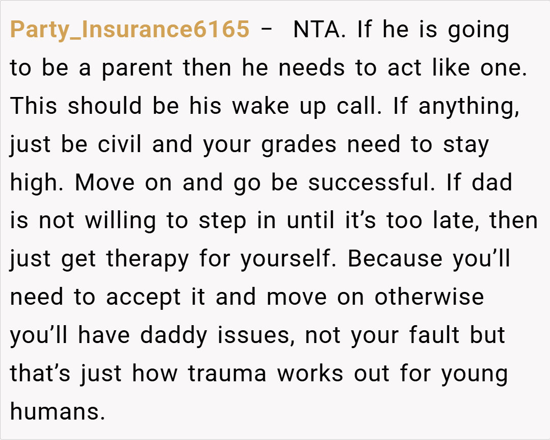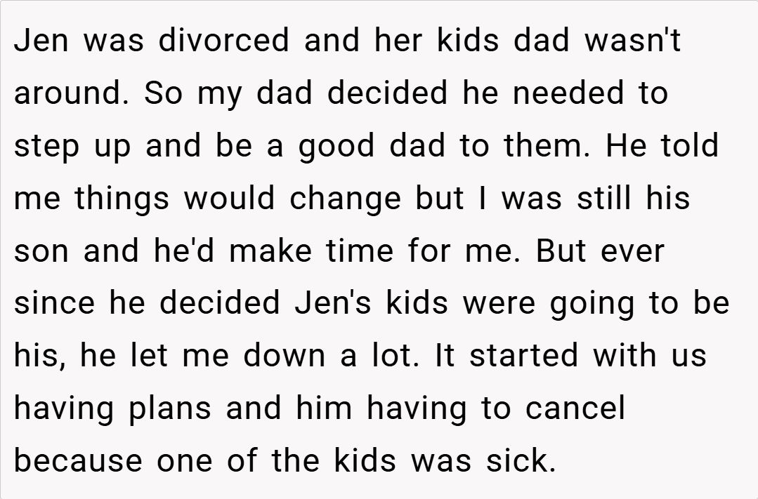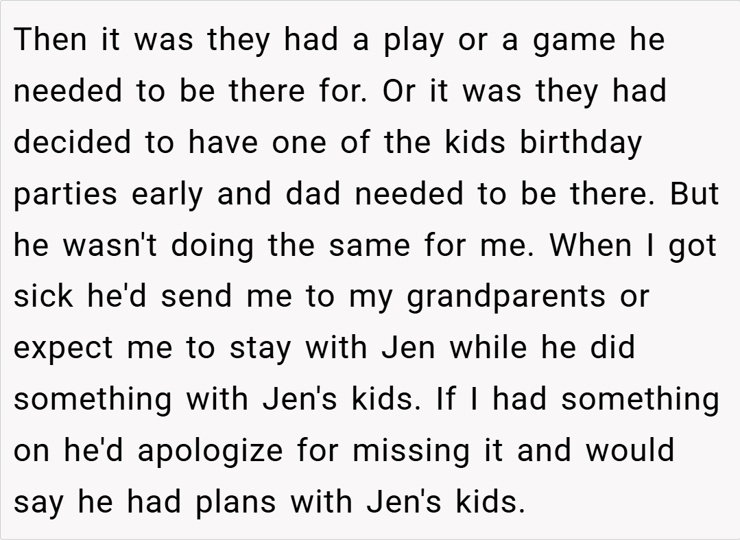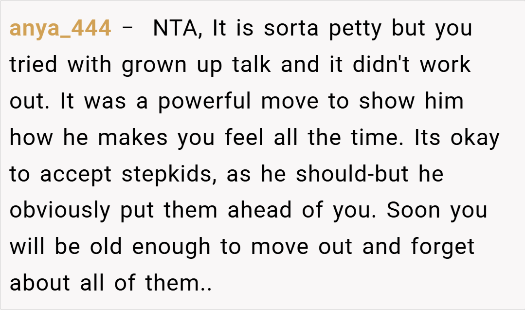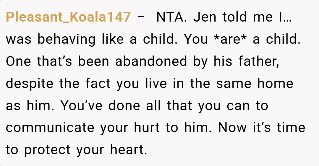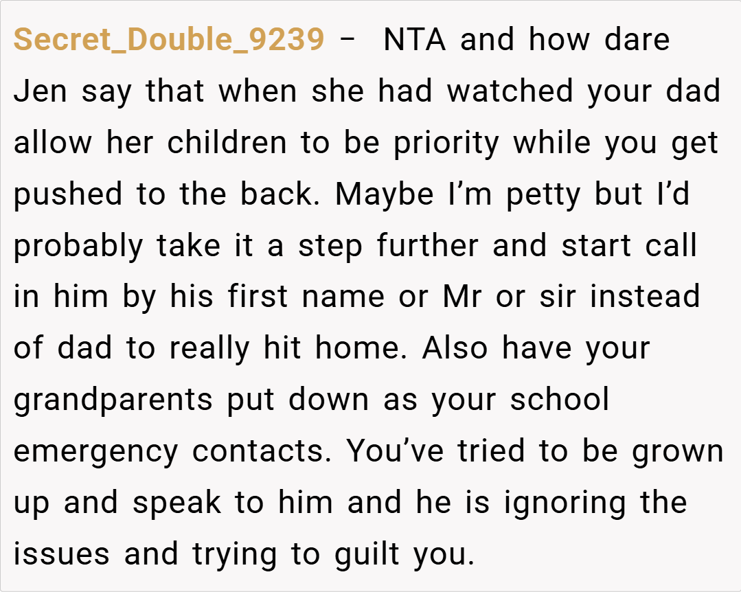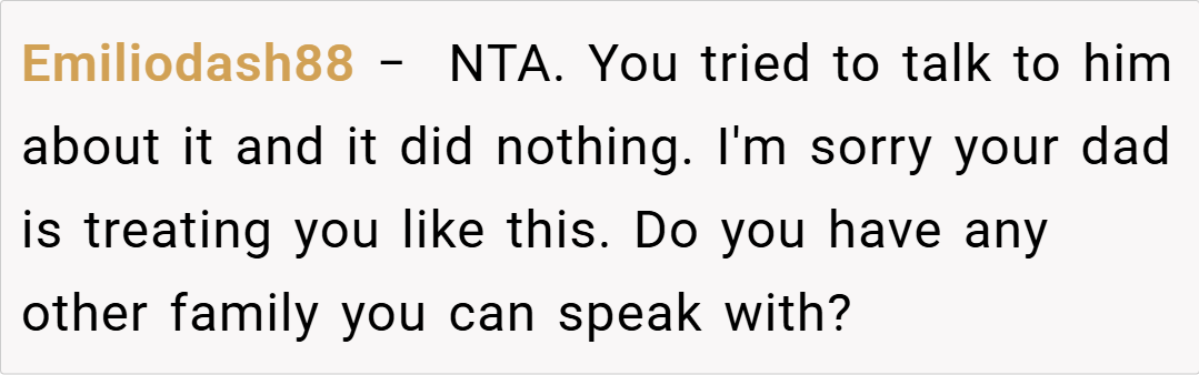 “Your story really struck a chord. I understand that it’s painful when a parent’s attention seems to shift, leaving you feeling unimportant. It sounds like your dad has been making excuses, and your silence might be his wake-up call. While it’s a tough decision, your feelings are completely valid. Sometimes, actions speak louder than words, and this might finally force him to reconsider his priorities.”