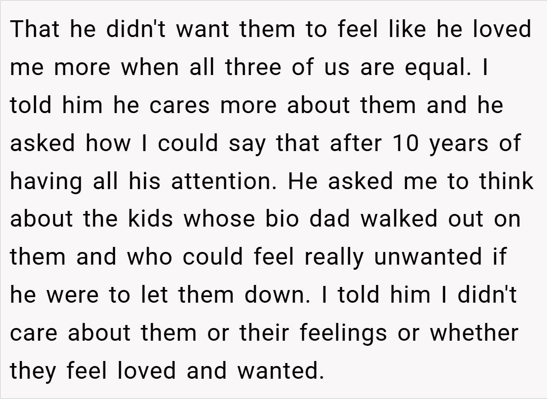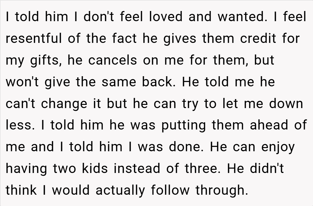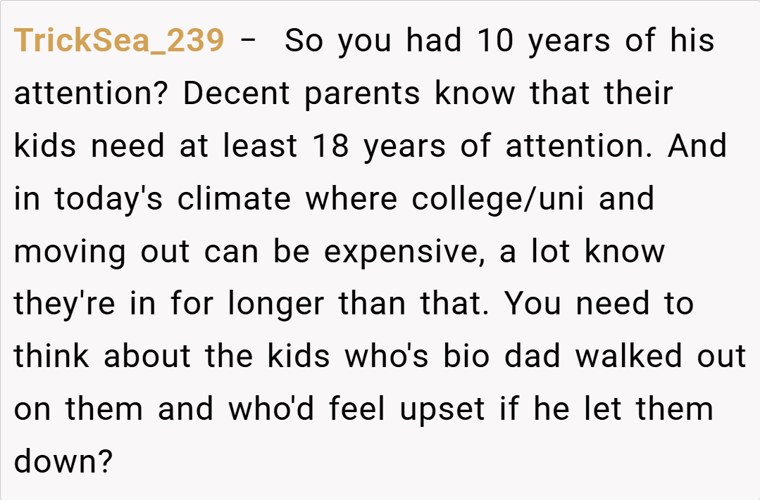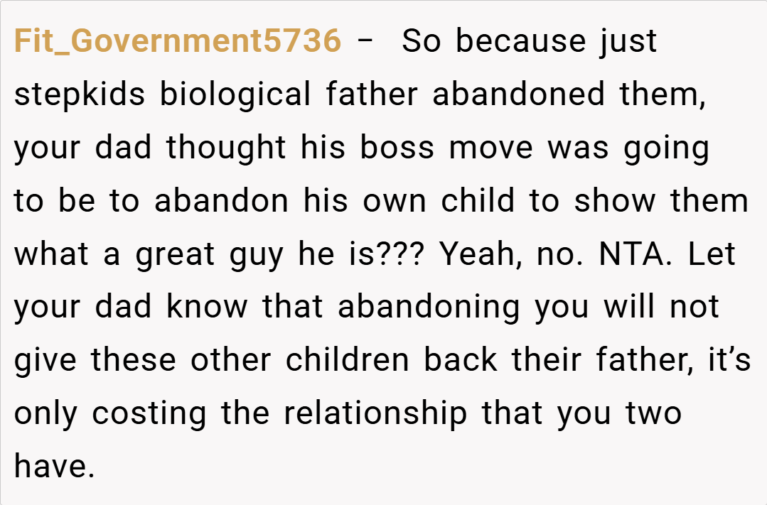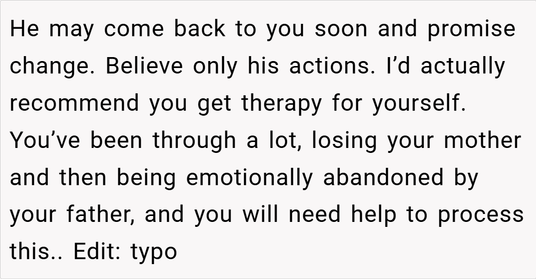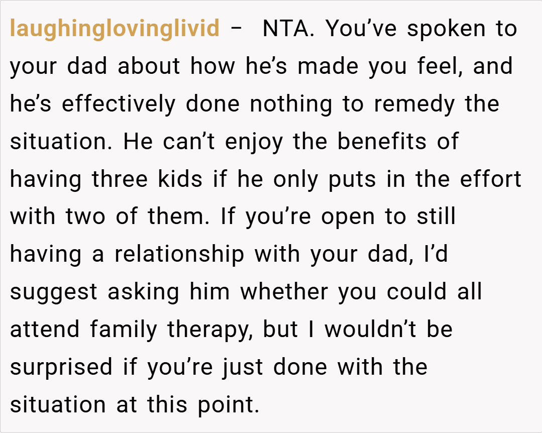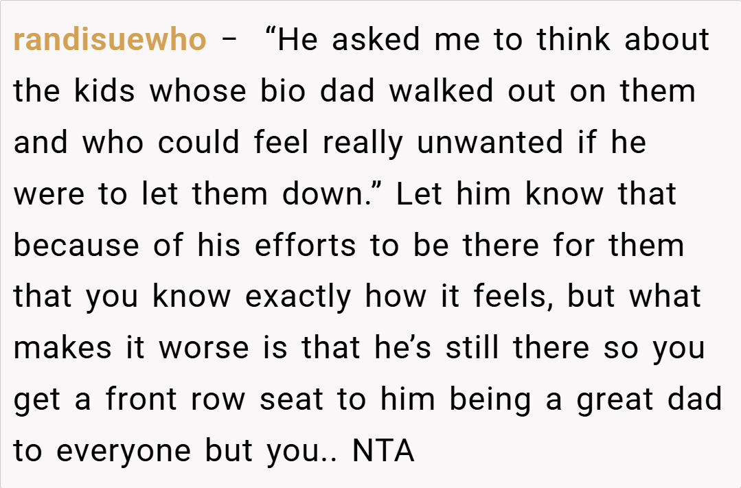 “Your story really struck a chord. I understand that it’s painful when a parent’s attention seems to shift, leaving you feeling unimportant. It sounds like your dad has been making excuses, and your silence might be his wake-up call. While it’s a tough decision, your feelings are completely valid. Sometimes, actions speak louder than words, and this might finally force him to reconsider his priorities.”