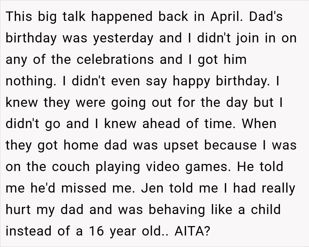 Family dynamics often shift in blended households, and this can leave long-established bonds feeling neglected or replaced. In the case at hand, the teenager’s decision to skip his dad’s birthday and withhold a gift is not merely a spur-of-the-moment act—it’s the culmination of years of perceived emotional abandonment. Experts in family psychology point out that when a child feels continuously sidelined,