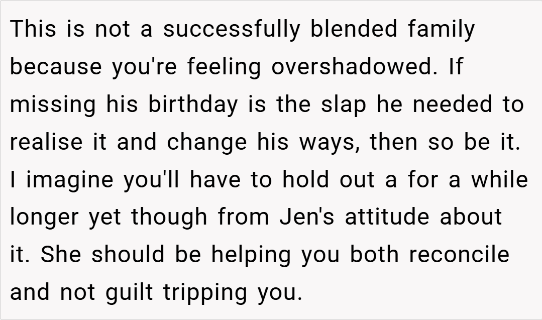 In blended families, the challenge is to integrate new members without marginalizing existing ones. Unfortunately, in this situation, the father’s repeated cancellations of plans and overt praise for his stepchildren have sent a clear message to his son: he is less important. The child’s protest—ignoring his dad’s birthday—serves as a poignant reminder of the lasting impact of these choices. Rather than resolving conflicts through calm dialogue, this silence has been his way to cope, even if it appears harsh.