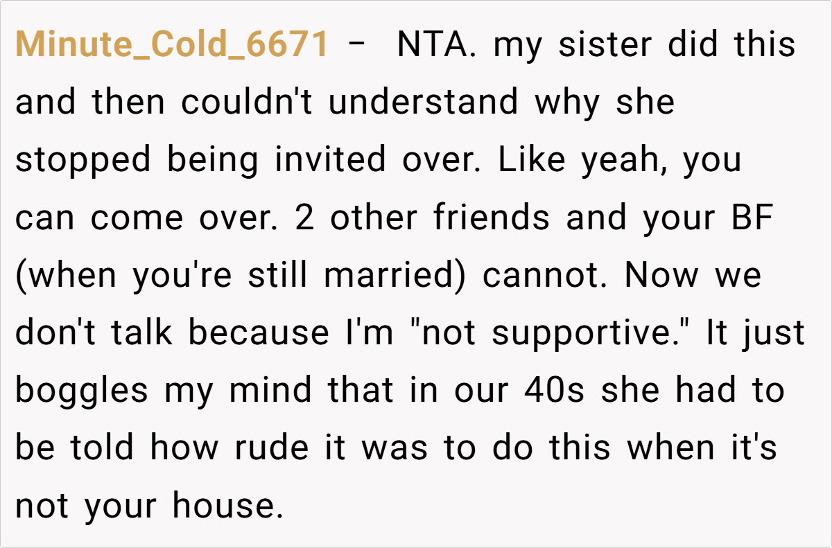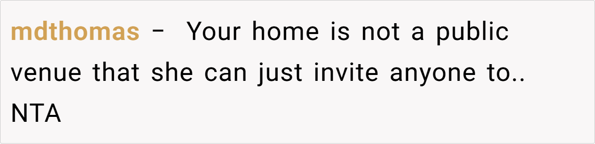 Across Reddit, the sentiment was clear: the friend’s behavior was over the line. Commenters noted that inviting unannounced guests into someone’s home is unacceptable and that personal space should be inviolable. Many advised simply saying “no” when plans become too intrusive, with some even suggesting a temporary break from the friendship until respect is re-established. The overarching message was that boundaries are non-negotiable—if a friend doesn’t honor them, the friendship might not be worth maintaining.