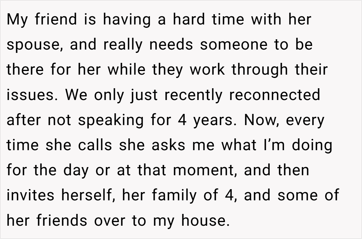 After reconnecting following a four-year silence, I thought our renewed friendship would be a welcome source of mutual support. But lately, every call from my friend has come with a hidden agenda—a last-minute invite for her entire family, plus a few extra friends, to turn my quiet home into an impromptu party venue. What started as a supportive gesture to help her through marital issues has morphed into an exercise in managing unwelcome house guests. It’s left me questioning how much I can give without feeling taken advantage of.