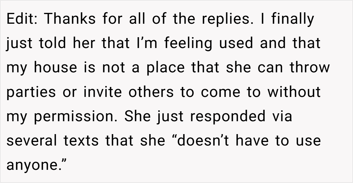 Taking action doesn’t mean you’re unsupportive. It means you’re prioritizing your well-being and encouraging your friend to seek healthier ways to address her personal challenges without encroaching on your space. After all, a supportive relationship should uplift both parties, not leave one feeling like a venue for impromptu parties against their will.