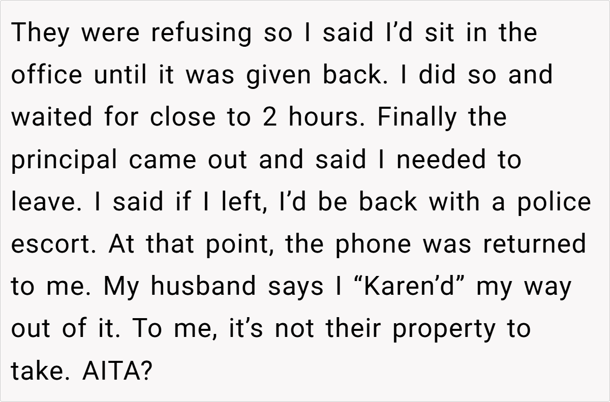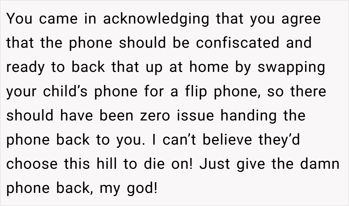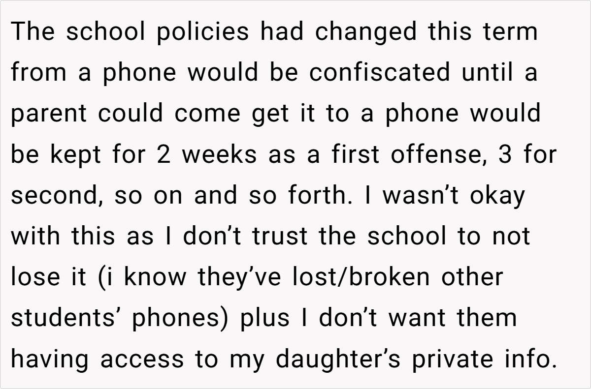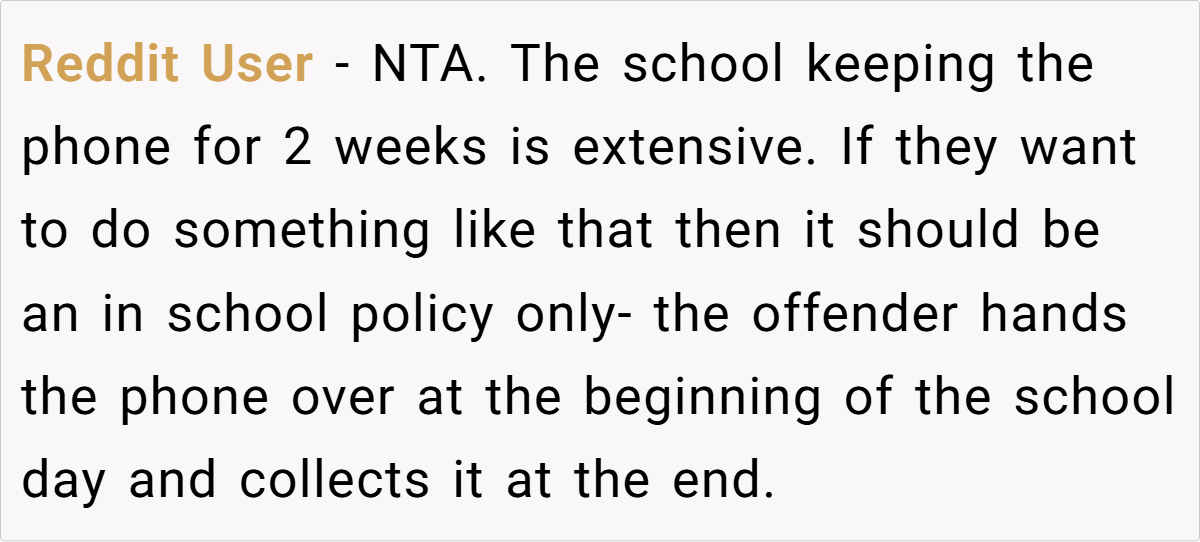 The school implemented a strict policy requiring confiscated phones to be held for two weeks. OP (Original Poster) wasn’t having it and took matters into their own hands—leading to a heated confrontation with school administrators. Was OP justified, or did they go too far?