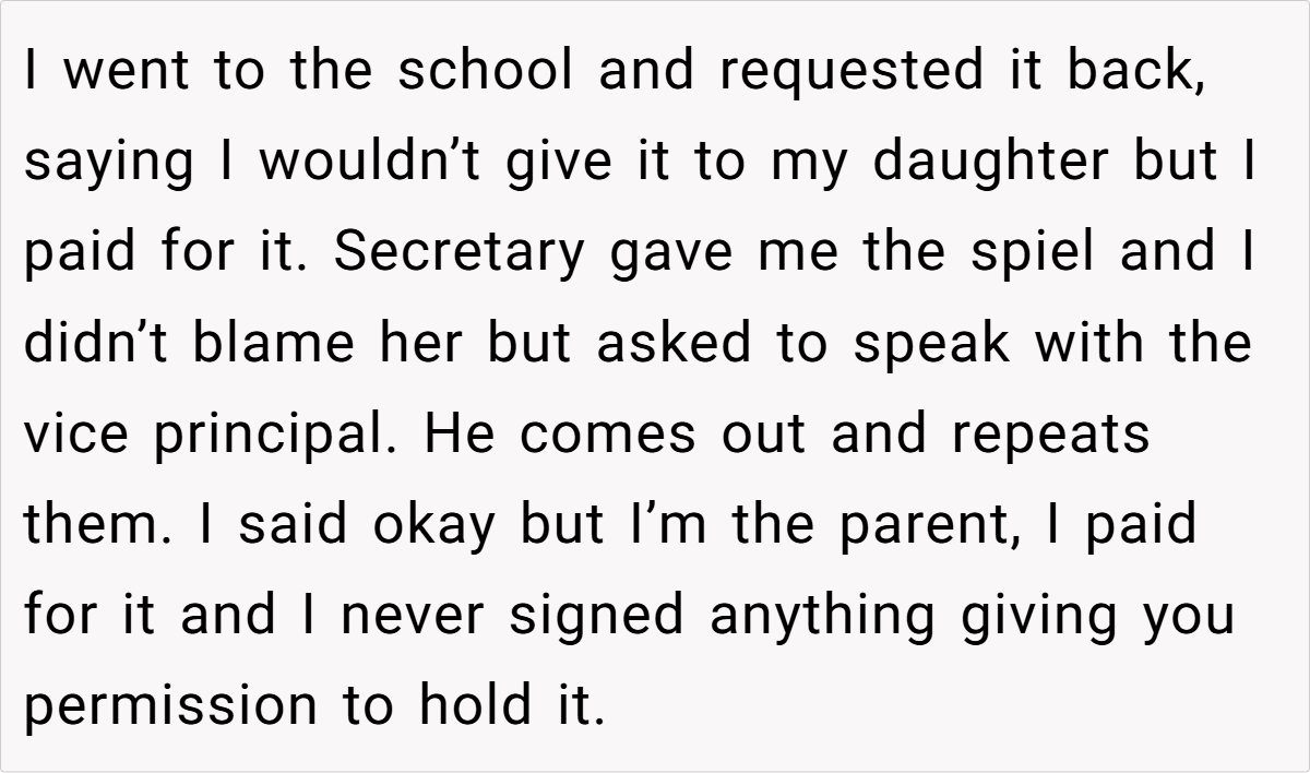 This directly aligns with OP’s experience, where the school refused to return a device OP had purchased, prompting a standoff that resulted in the administration finally conceding. The situation highlights how a well-intended policy can clash with legal and parental rights, leading to unnecessary conflict.