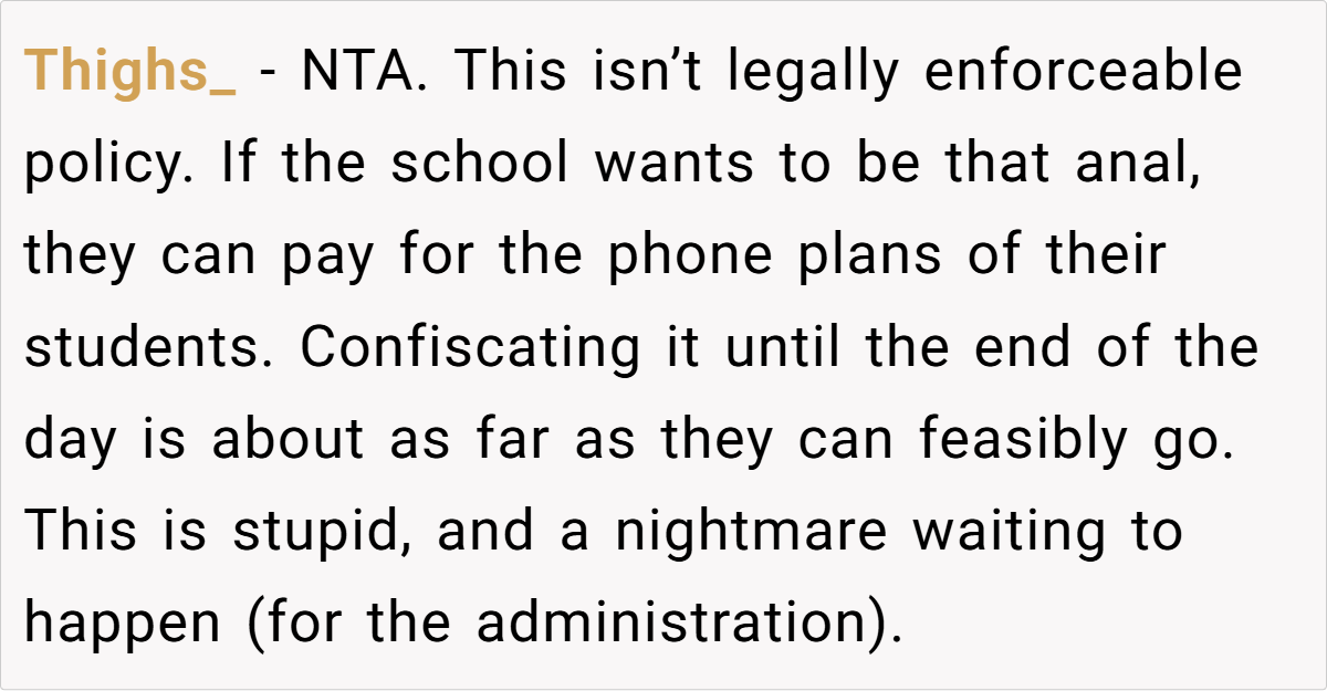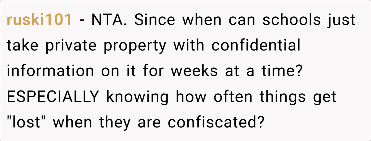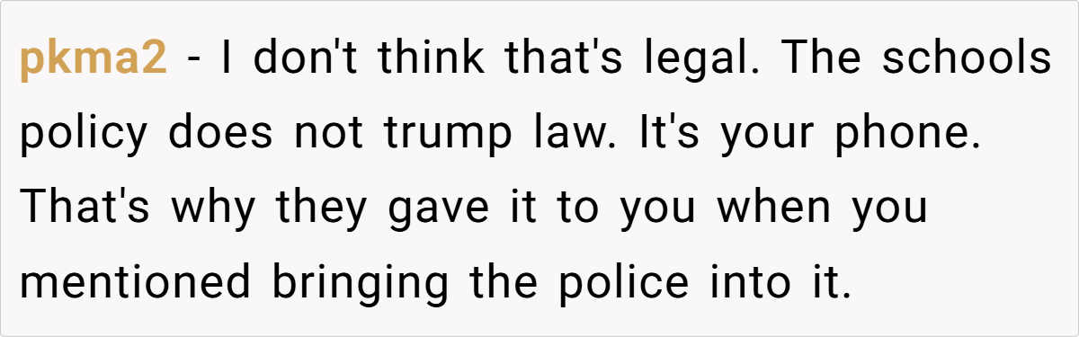 According to the American Civil Liberties Union (ACLU), “Schools may impose disciplinary measures for misuse of technology, but they must ensure that policies do not violate students’ rights or overextend their authority.” OP’s insistence that the phone was legally theirs, not the school’s, aligns with these concerns.