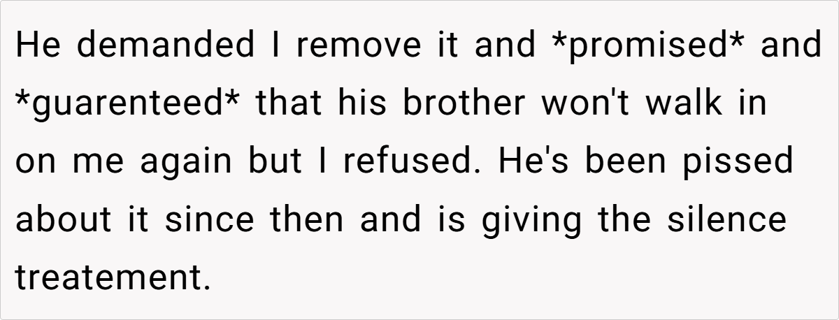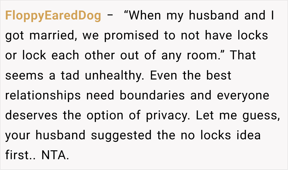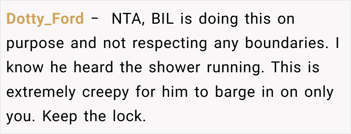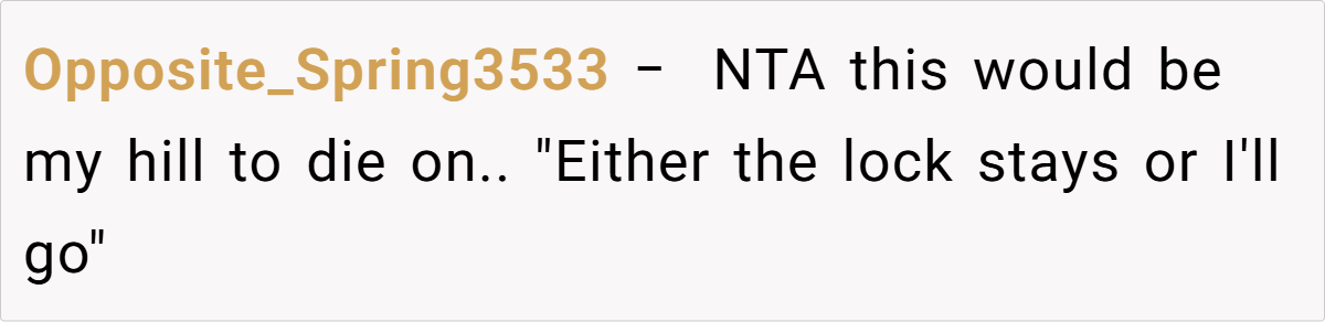 Other responses warned of a slippery slope, suggesting that if the intrusive behavior isn’t checked now, it could lead to even more invasive patterns. The overwhelming consensus was clear: respecting personal boundaries is non-negotiable, and installing a lock is a reasonable response when privacy is repeatedly compromised.