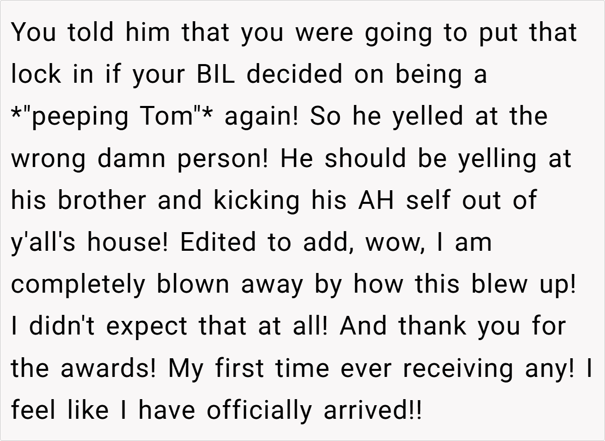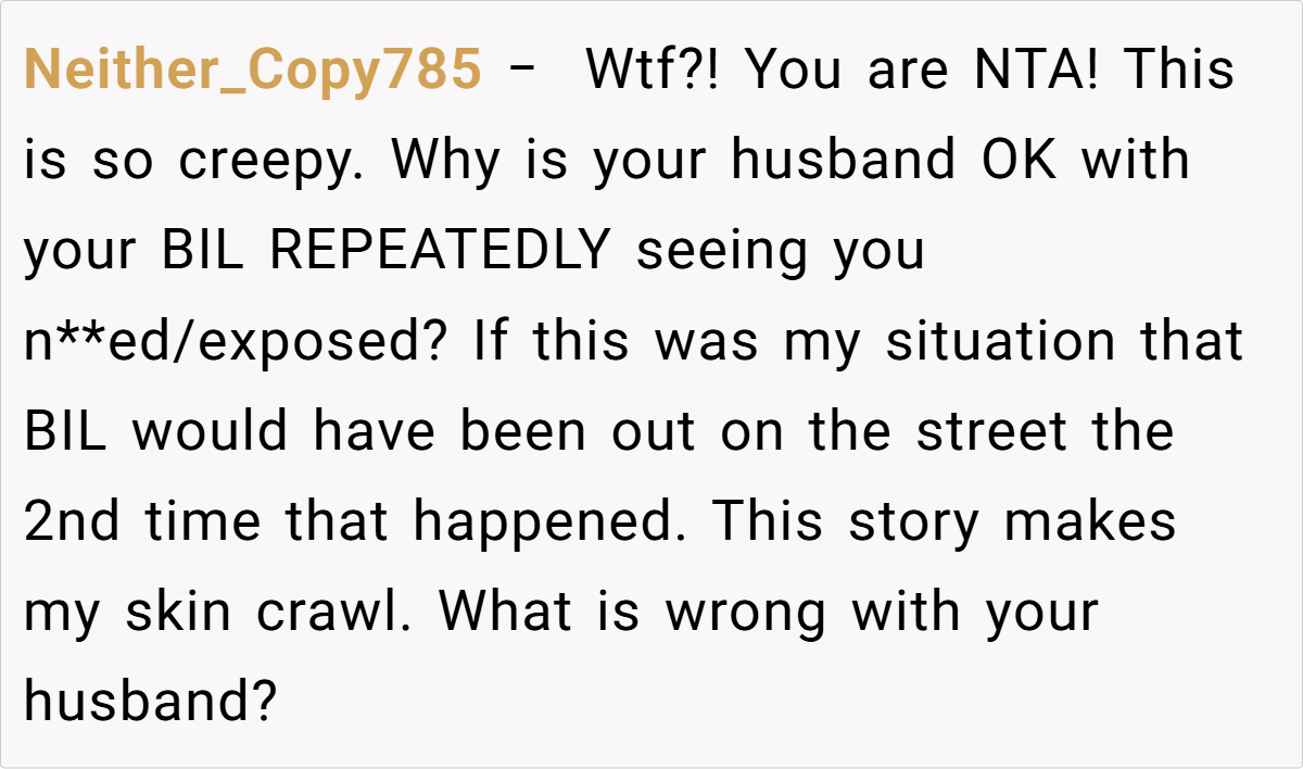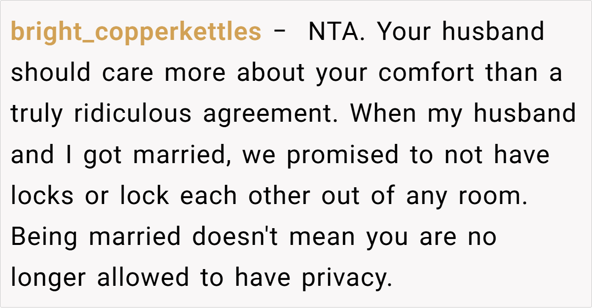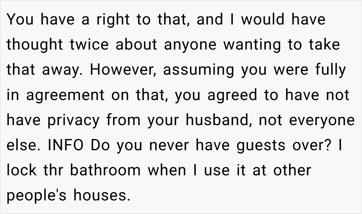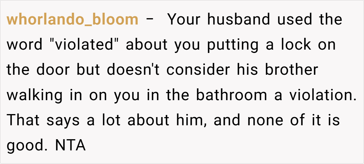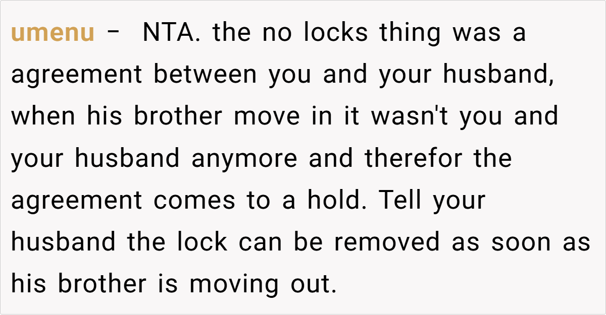 One Reddit user commented, “Your home is your sanctuary—no one should get a free pass to invade that, regardless of old agreements.” Another noted, “If your husband’s brother is treating your home like his personal restroom without a knock, it’s time for a lock. Boundaries are not negotiable.” Several users expressed similar sentiments, emphasizing that while marital promises are important, they should never come at the expense of one’s personal safety and comfort.