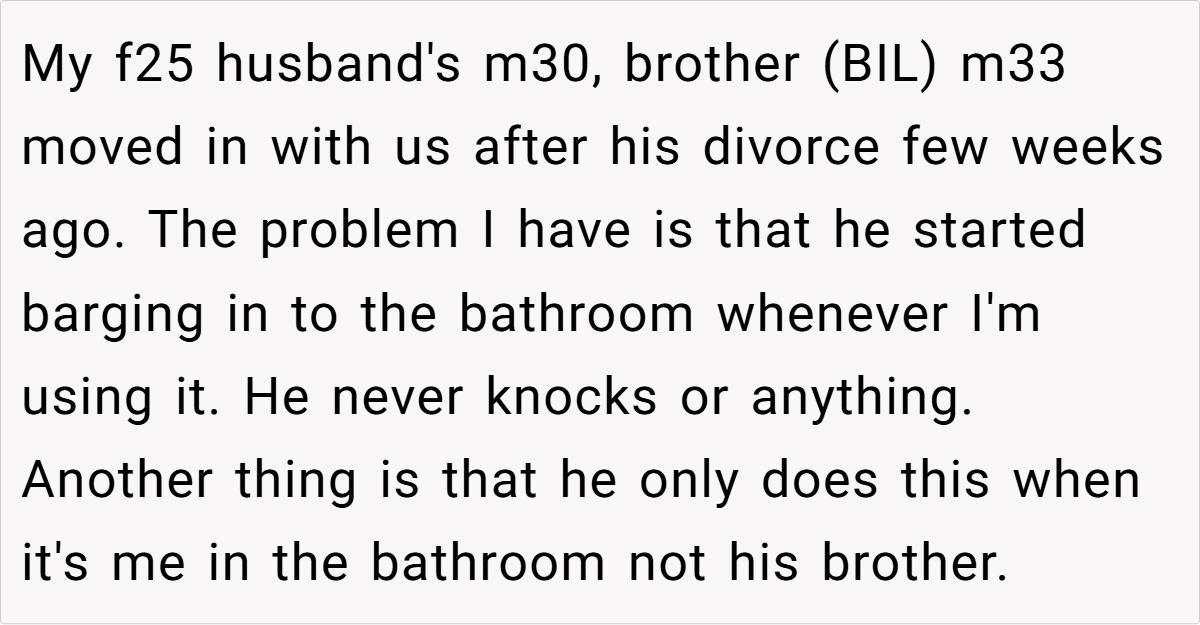 When you invite family into your home, you expect a degree of comfort and respect—especially in your own private spaces. But what happens when that expectation is blatantly ignored? In this case, a 25-year-old wife found herself increasingly frustrated as her 30-year-old husband’s recently divorced brother moved in and began barging into the bathroom without knocking.