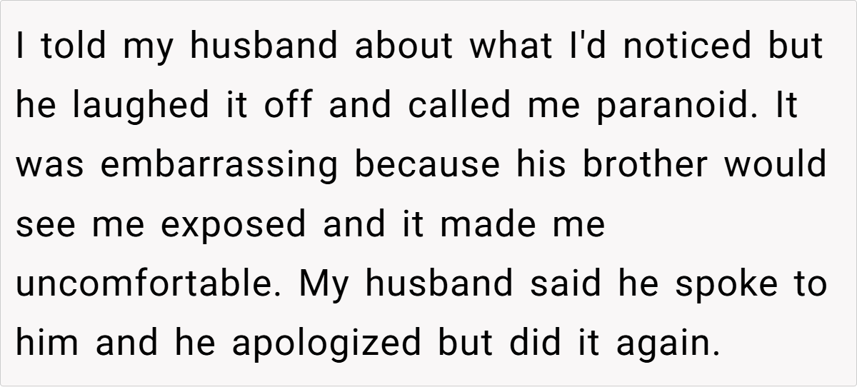 The situation reached a boiling point when the brother-in-law, in full knowledge that his sister-in-law was showering, walked in claiming he needed to pee. After repeated incidents and her husband’s dismissive response—laughing off her concerns as paranoia—she finally took matters into her own hands.