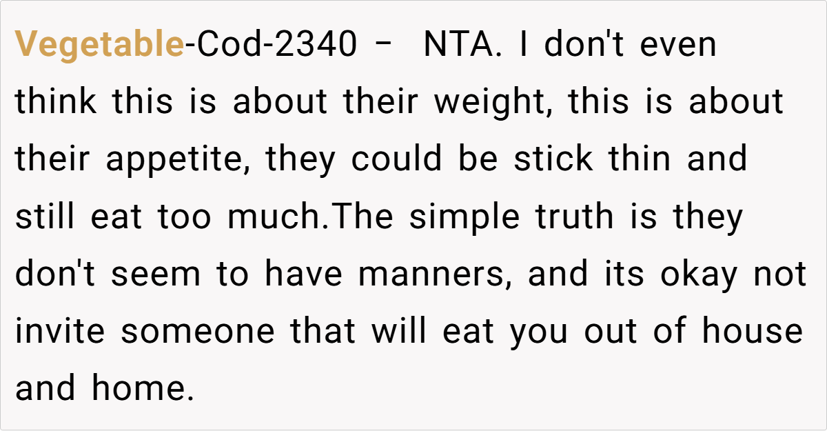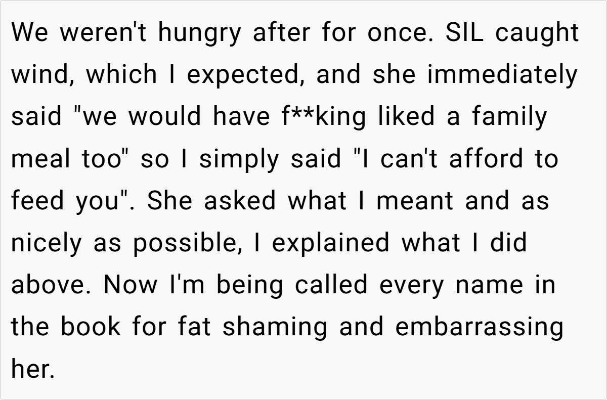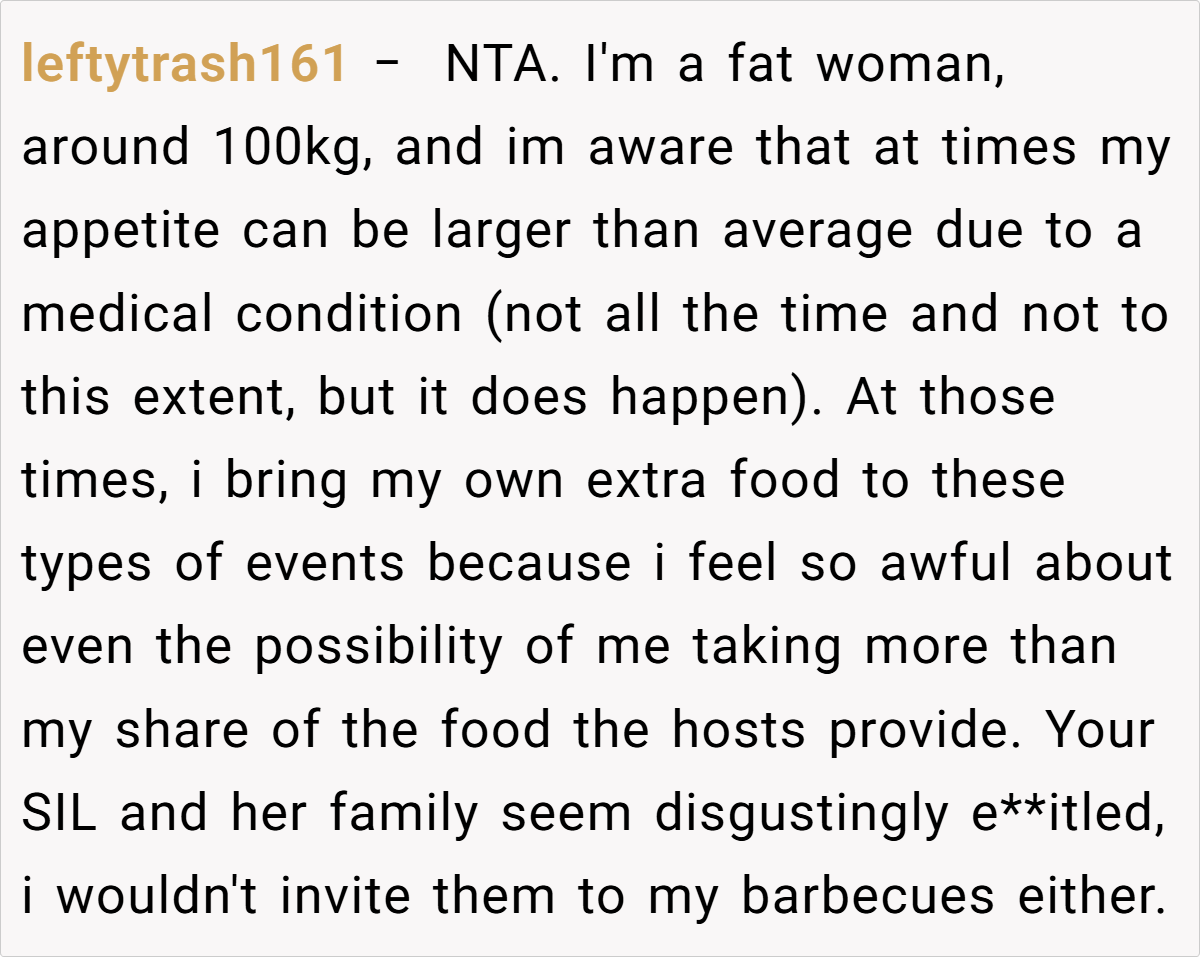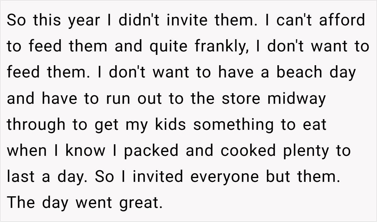 A person excluded their sister-in-law (SIL), her husband, and their child from a family BBQ and beach day due to past experiences where they consumed large amounts of food, leaving others without enough. The person explained they could not afford to feed them, which led to accusations of fat-shaming from the SIL. Despite the backlash, the person felt justified, emphasizing the challenges of managing food for everyone. read the original story below…