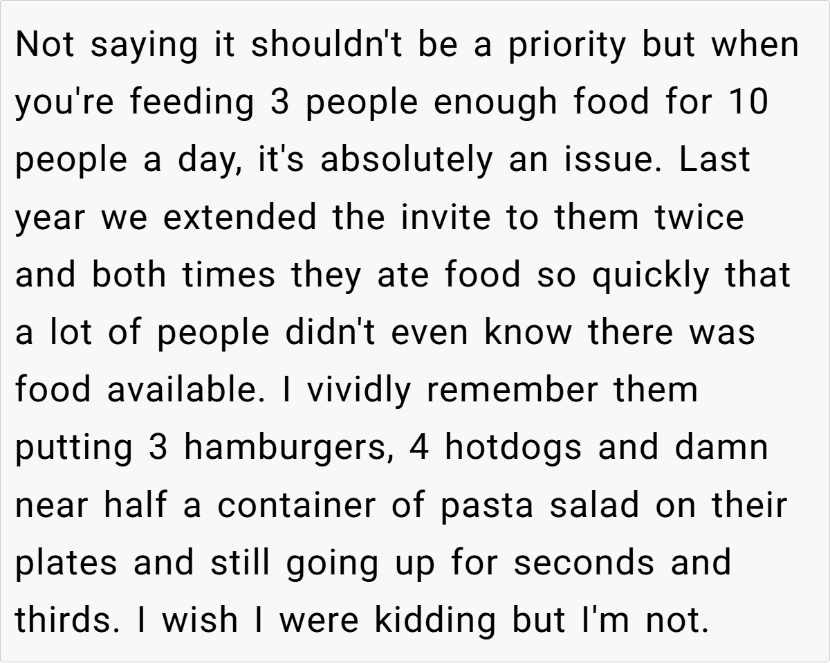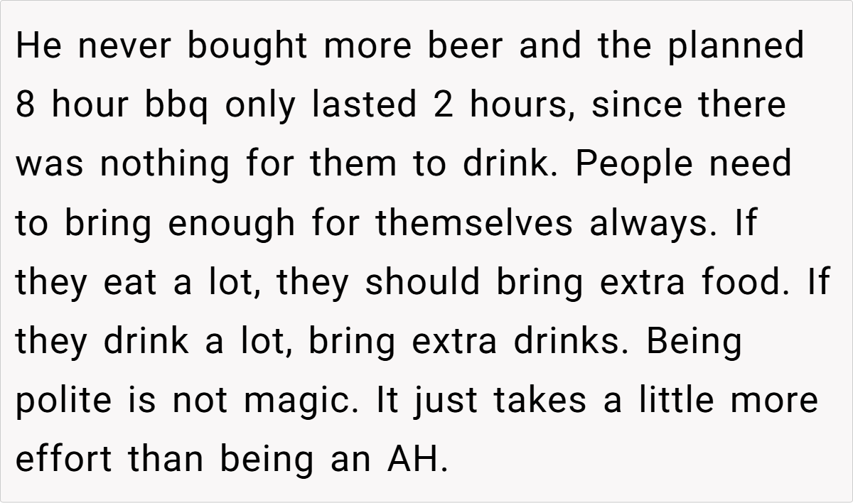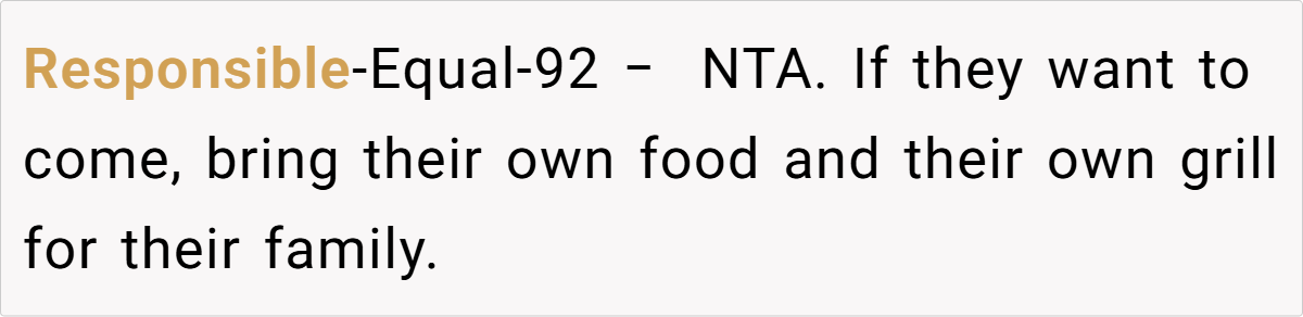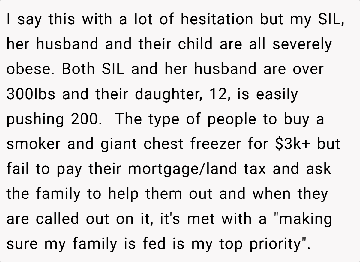 A person excluded their sister-in-law (SIL), her husband, and their child from a family BBQ and beach day due to past experiences where they consumed large amounts of food, leaving others without enough. The person explained they could not afford to feed them, which led to accusations of fat-shaming from the SIL. Despite the backlash, the person felt justified, emphasizing the challenges of managing food for everyone. read the original story below…