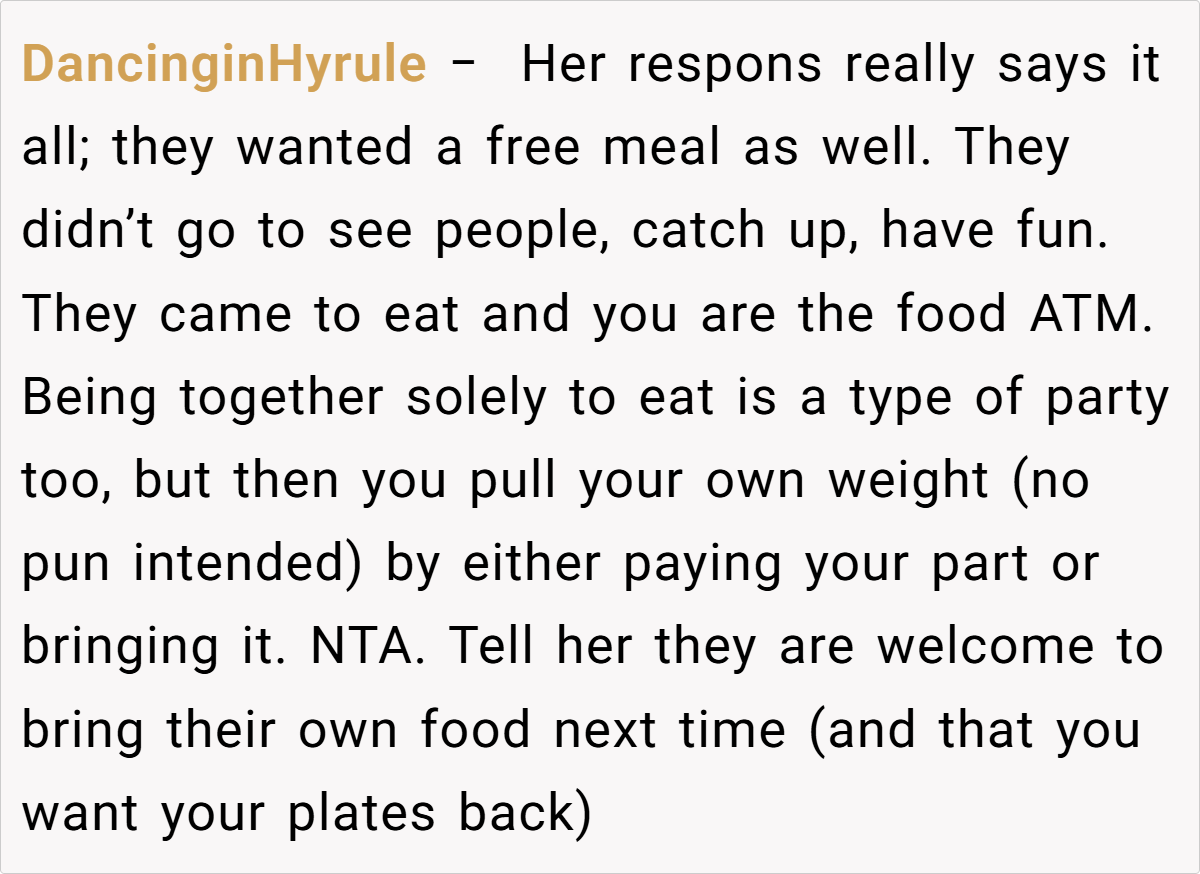It was a beach party. There were enough whales in the ocean…no need to invite more. It’s annoying to see people act gluttonous at the expense of others, which is why I said what I said. They don’t need to be invited to any meals until they start returning dishes, learn to control their eating, contribute to the meal and learn manners by asking for leftovers instead of just taking them. You should have asked her when SHES going to host a family meal, since she stated she wanted to attend one. People who take and never give are truly despicable!